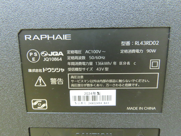 ドウシシャ・RAPHAIE・43型・液晶テレビ・2024年製・RL43RD02・中古品・152453