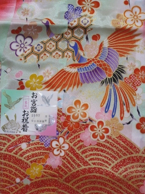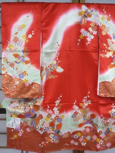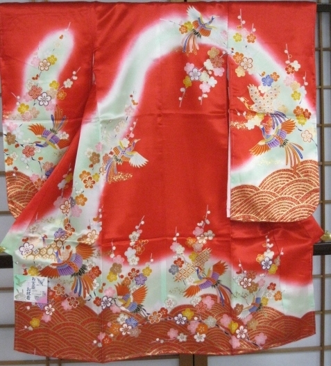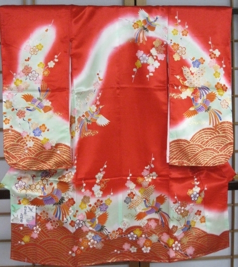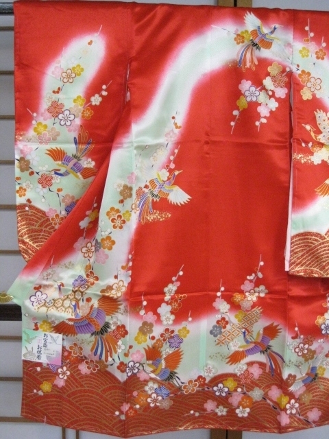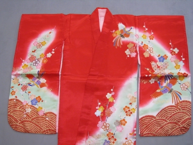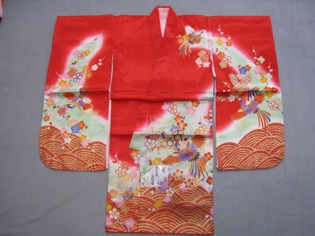 ★ 新品 三つ身(三ツ身)きもの ミニ振袖絵羽柄 襦袢付 赤色系