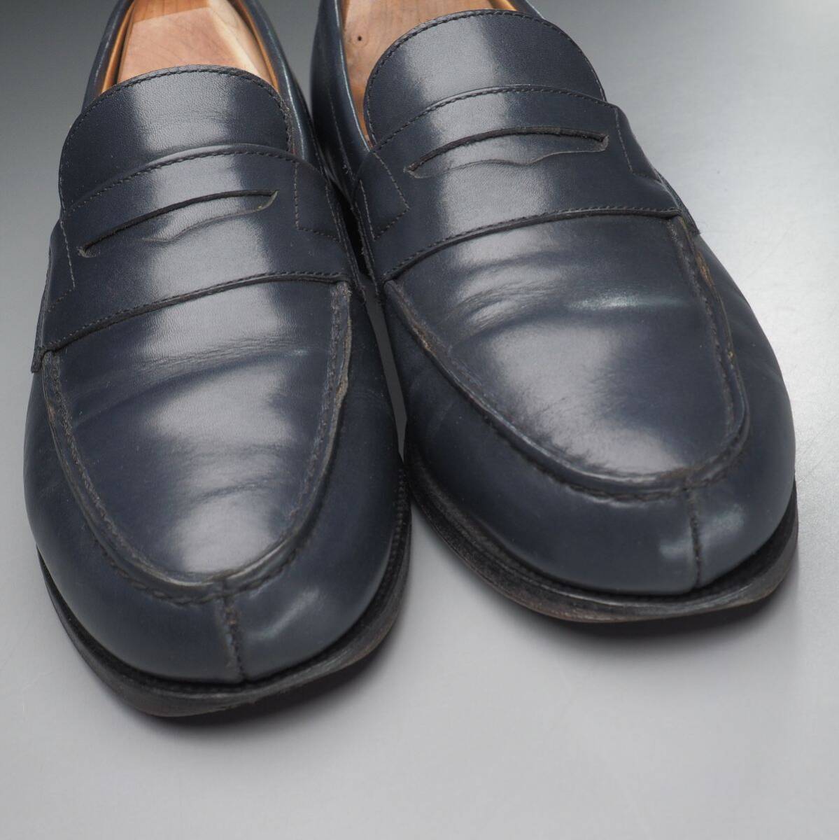 【コンディション詳細】 アッパーのシワや薄い擦れ、フロントのモカ割れ、インソールやライニングの薄い擦れや汚れなど見られますが、その他気になるようなダメージ等なくこれからも気持ちよくご愛用いただけます。 アウトソールの減りはトゥ・ヒール共に4~5mm程度、トゥ部分に関しましては減りがウェルト部分に達しておりますので、ご落札後に半張りなどの補強・補修をお勧めいたします。 |
