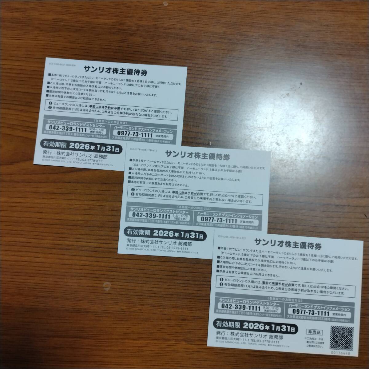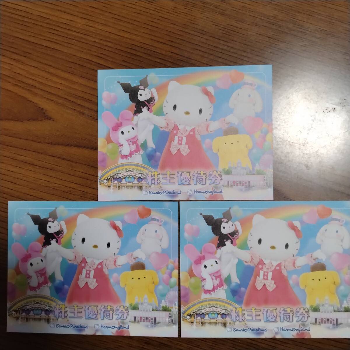 サンリオの株主優待券3枚セットです。 本券1枚でサンリオピューロランドまたはハーモニーランドのどちらか1施設を1名様1日に限り、通常営業時間内のみにご利用いただけます。 有効期限は2026年1月31日