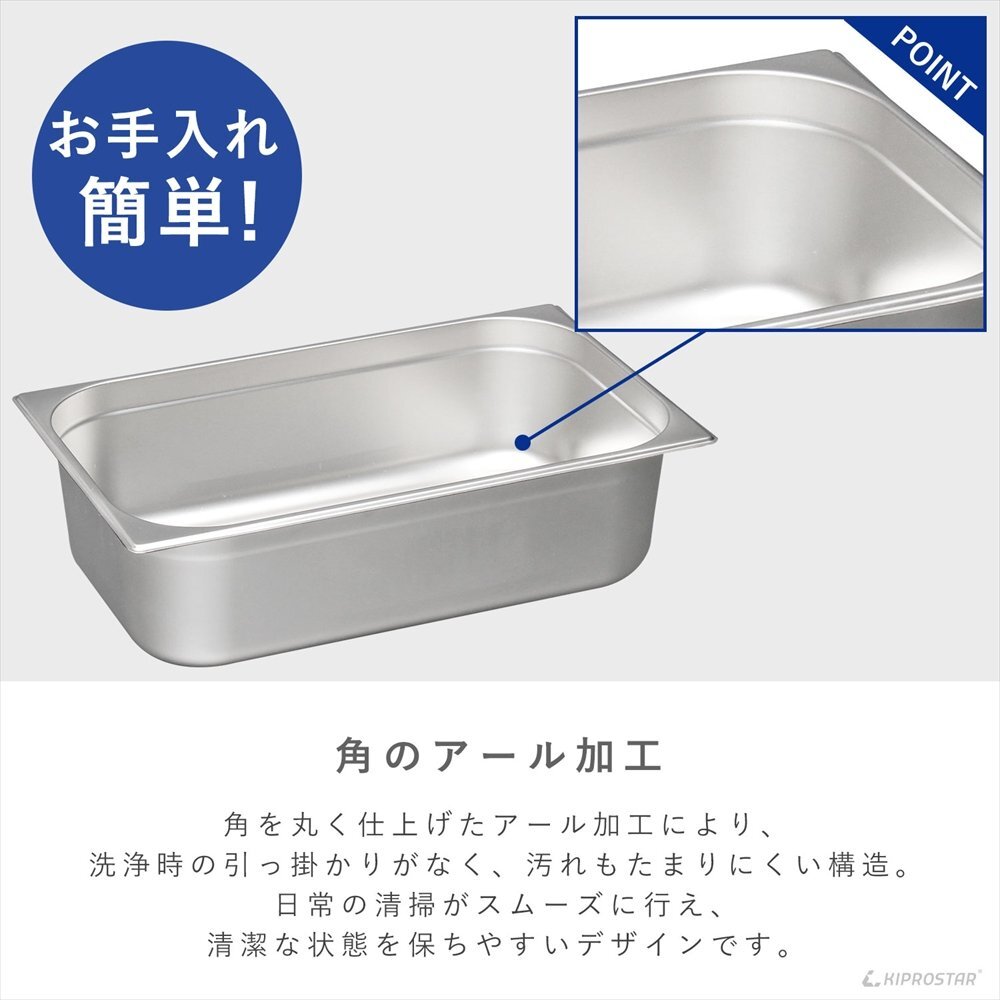 | 説明 | 角がアール加工されており、洗いやすく汚れがたまりにくいシンプルなデザイン。 ステンレス製の衛生的なホテルパンです。 |