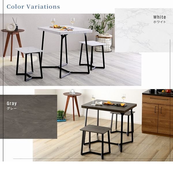 綺麗な大理石調のシートが部屋にオシャレさとクールな雰囲気を演出する大理石調ダイニング3点セット! スタイリッシュなブラック脚と大理石調WH、GYの天板で高級感あります。 テーブル幅75cmの2人掛けでコンパクトなサイズなので、スペースを取らないです。 テーブル、チェアは耐荷重100kgで丈夫でしっかりしています。 テーブル脚にはアジャスターが付いているのでガタツキなど調整できます。 |
