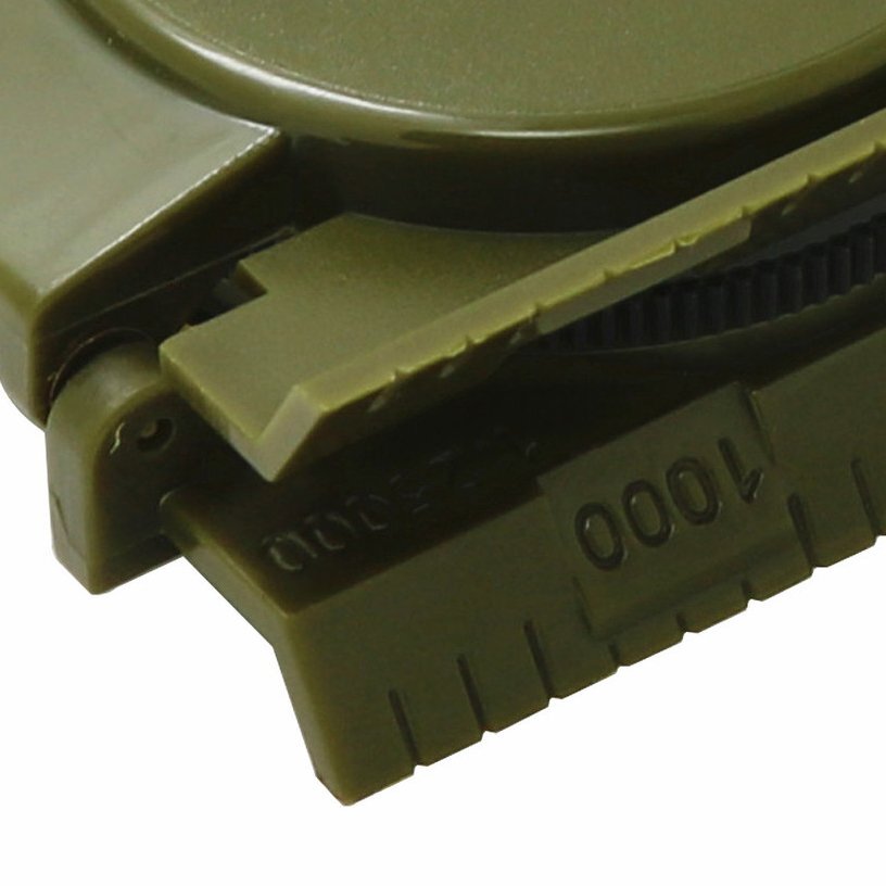 細かい目盛を確実に読むための小型レンズと目標物の方角を捕えることのできる覗き窓があり、サイティングポイントとカーディナルは暗くても視認しやすいルミナスポイント。
