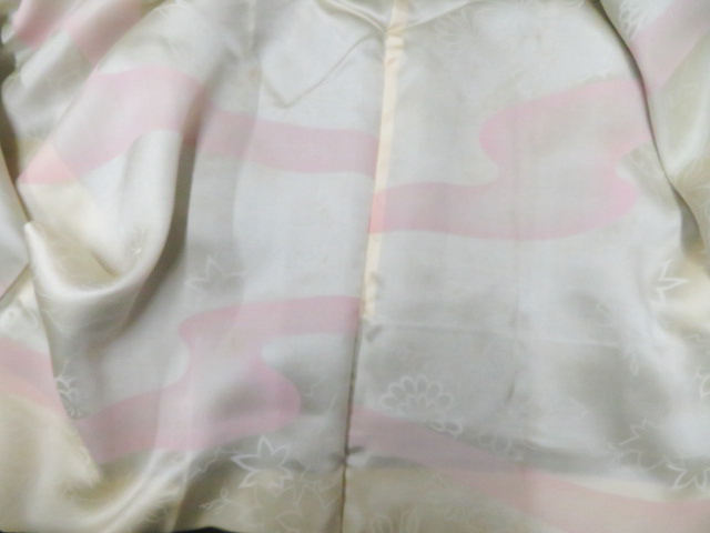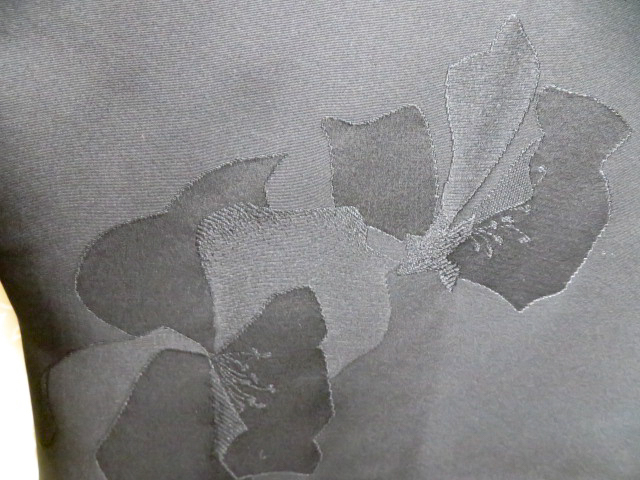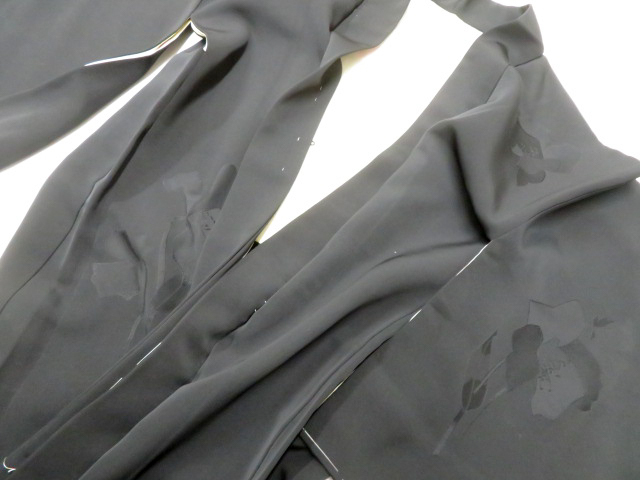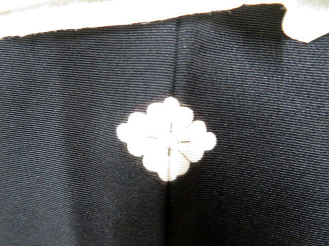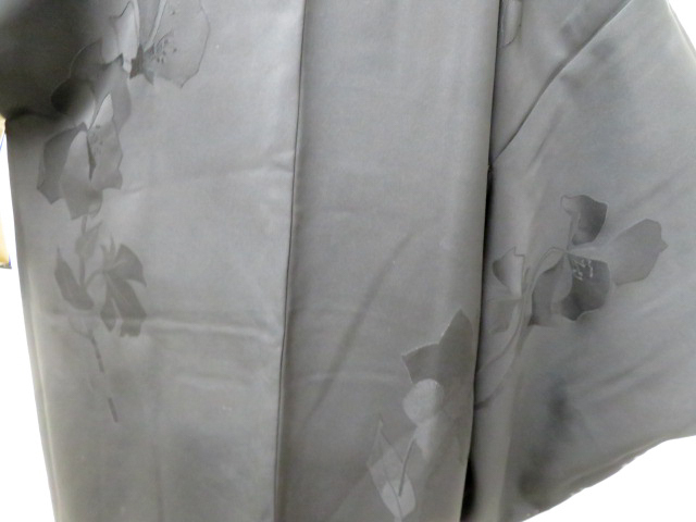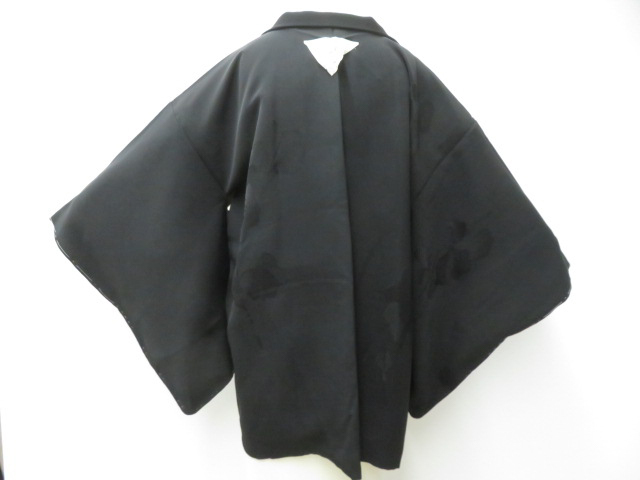 リサイクル商品のため、羽裏にシミ、左袖、衿などその他所々に薄汚れがございますが着用可能なお品です。 地色は、黒色です。 1枚目の画像が近いお色かと思われます。 素材は正絹です。 |