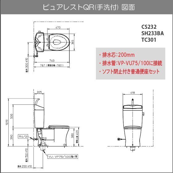 便器 ピュアレストQR(手洗付) ソフト閉止付き普通便座セット CS232B,SH233BA,TC301 TOTO 床排水 排水芯200mm ★