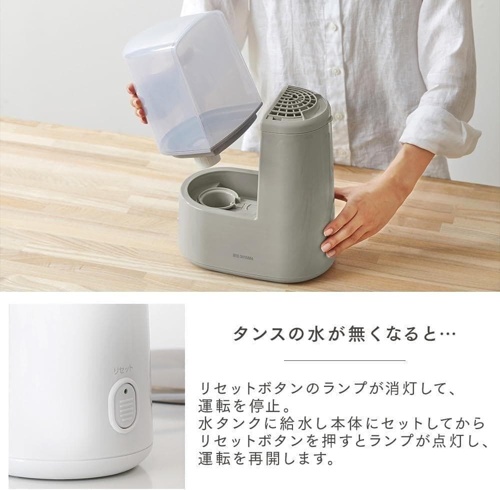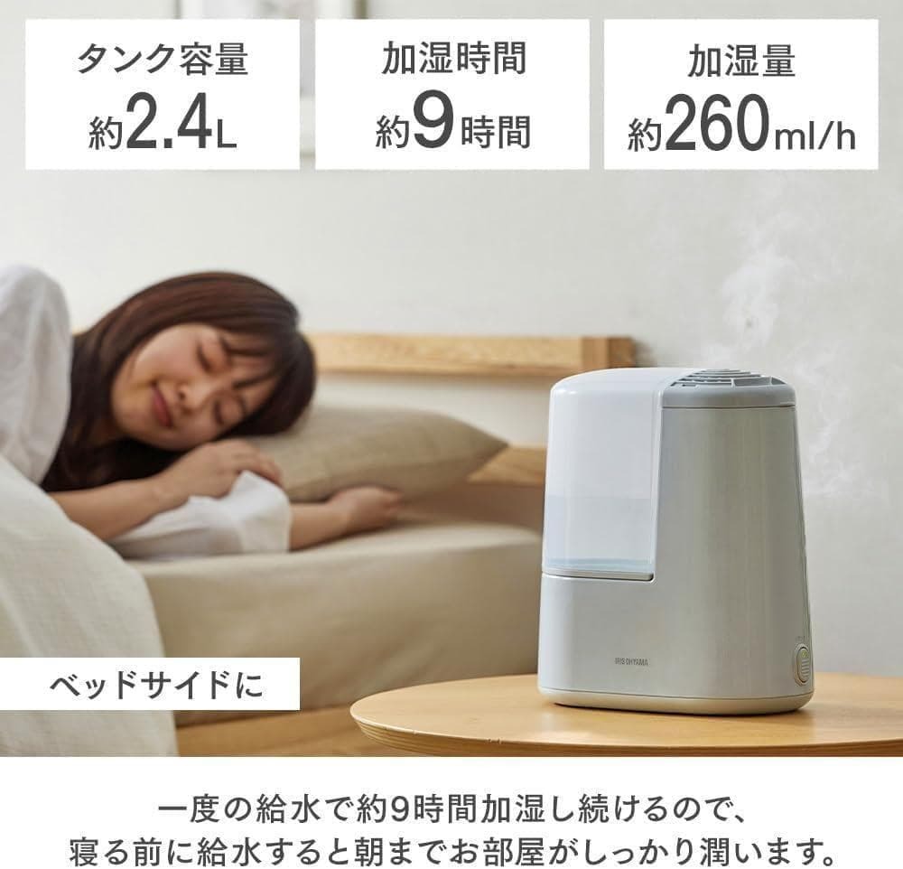 加熱した水で長時間加湿するから衛生的。寝る前に給水すると朝までお部屋がしっかり潤います。コンパクトなので寝室への持ち運びも軽々