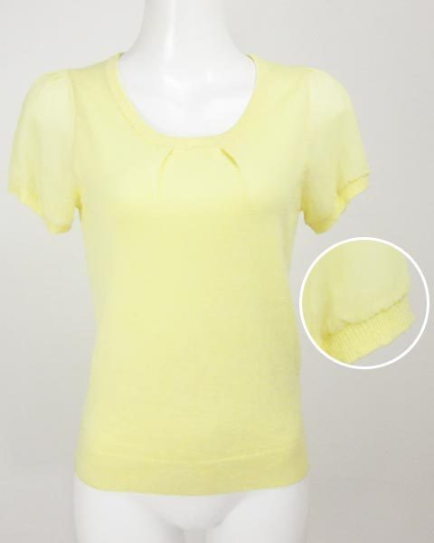| 明るめ黄色のお顔周りを明るくしてくれるアンサンブルニット。インナーのお袖は透け感のあるシフォンでカジュアルエレガント。カーディガンにはお首周りにはビジューがついていてネックレスをつけているかのような華やかさがあります。単品使い、セット使いが楽しめるアイテムです。 |