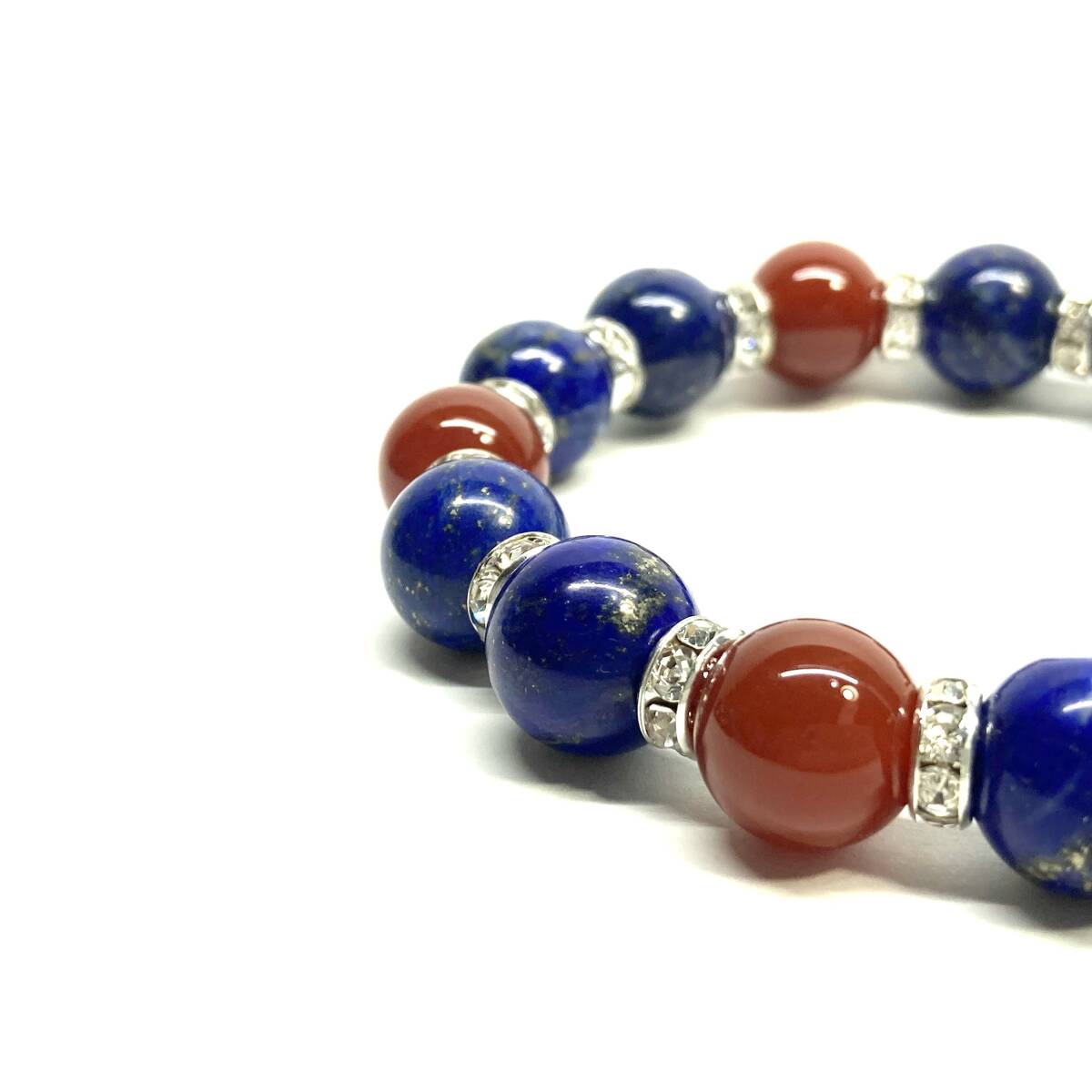 こちらは、ラピスラズリと赤瑪瑙を組み合わせたパワーストーンブレスレットです。間にはロンデルを挟み高級感あるデザインに仕上げております。程よくインパクトがある12mm玉を使用して内周約18cmです。(サイズ変更の場合は取引ナビにてご連絡をお願いします。) 数に限りがございますので気になる方はお早めにどうぞ。
