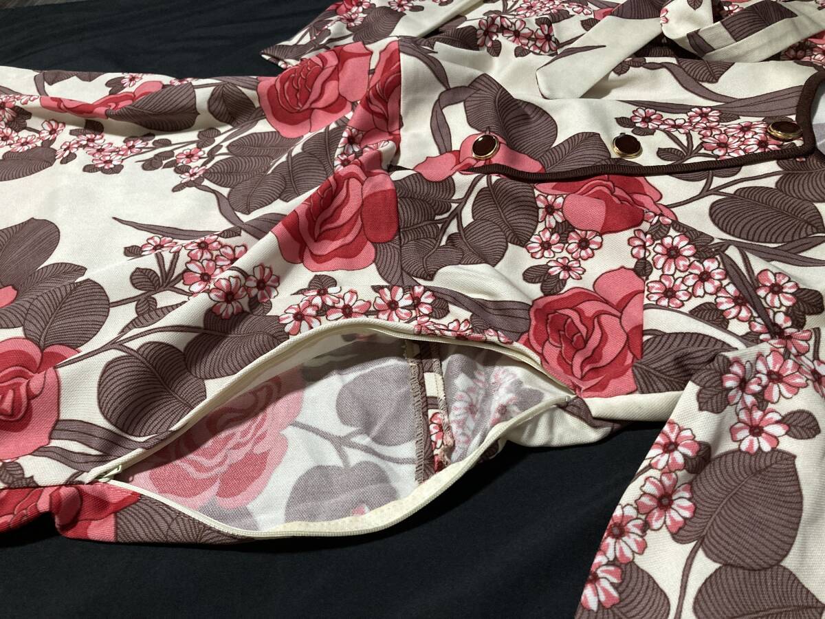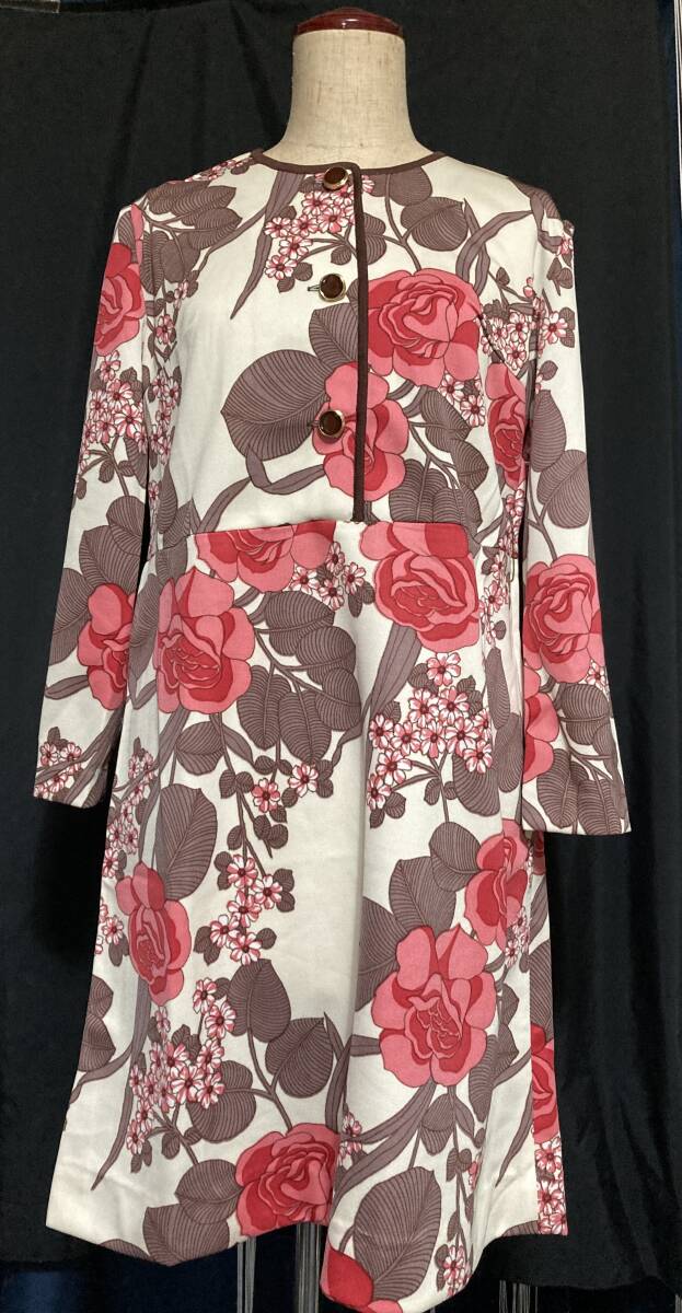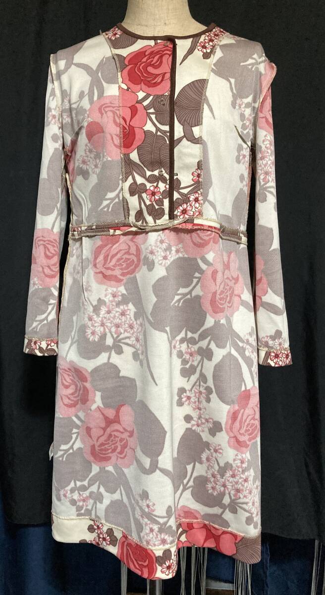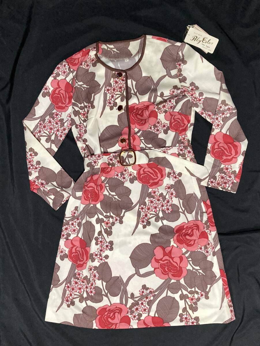 レトロなノーカラーワンピース デッドストック 未使用 retro floral pattern Vintage 1970s Retro Pink Rose fuchsia Bold Dress 花柄
