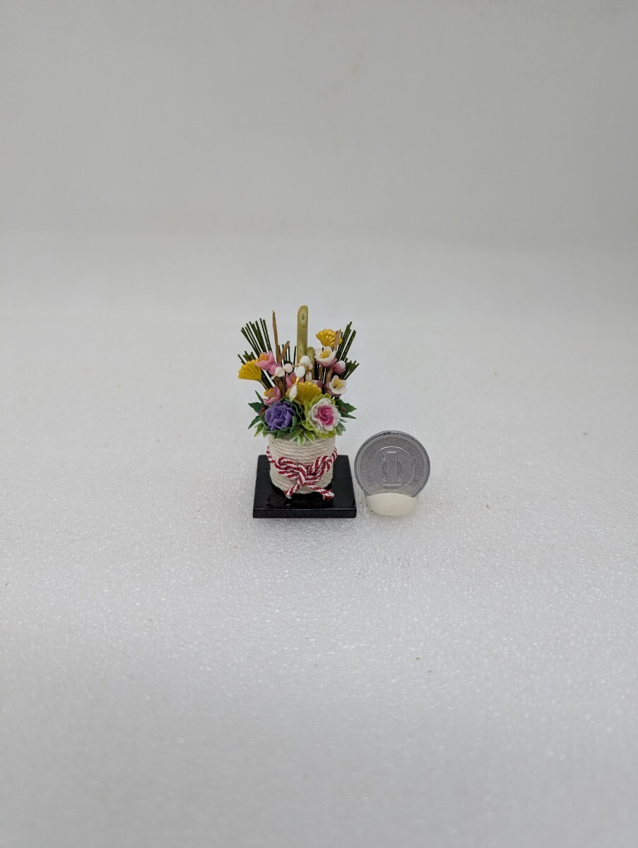 樹脂粘土で紅白梅、葉牡丹、千両、ささを作り 門松を作りました。