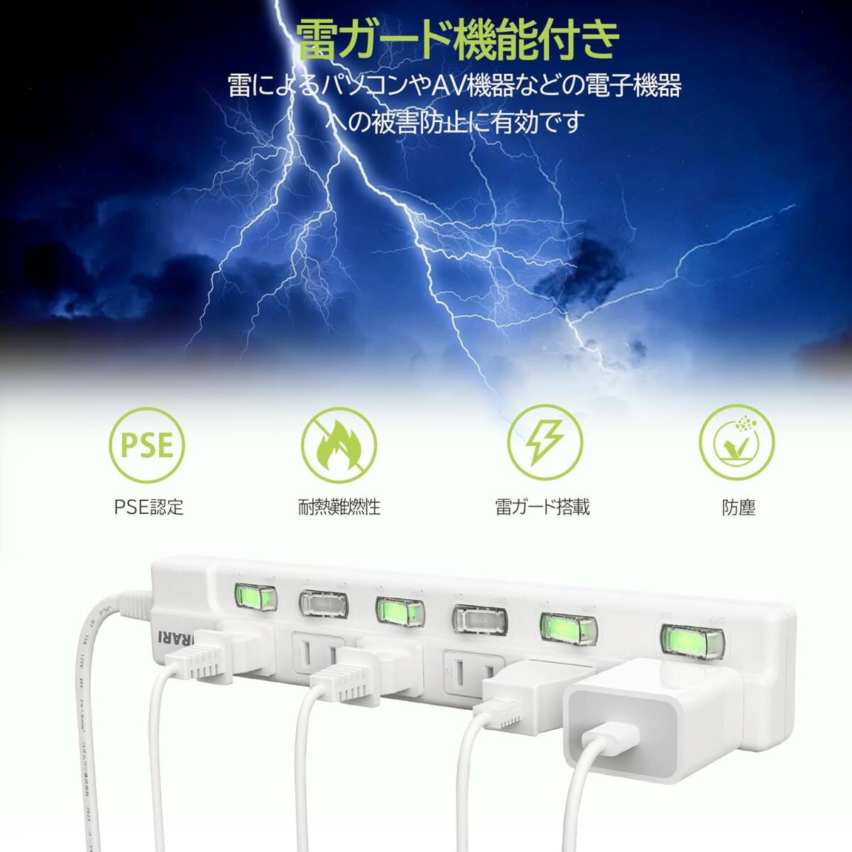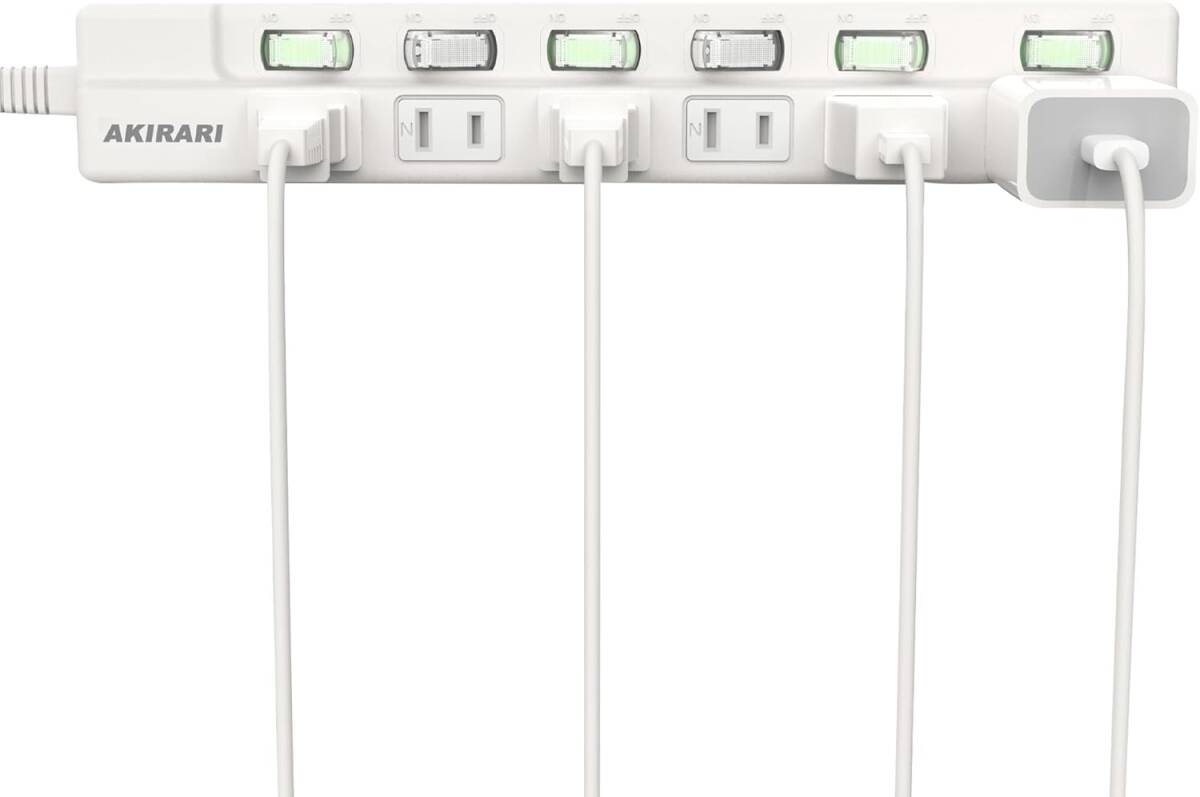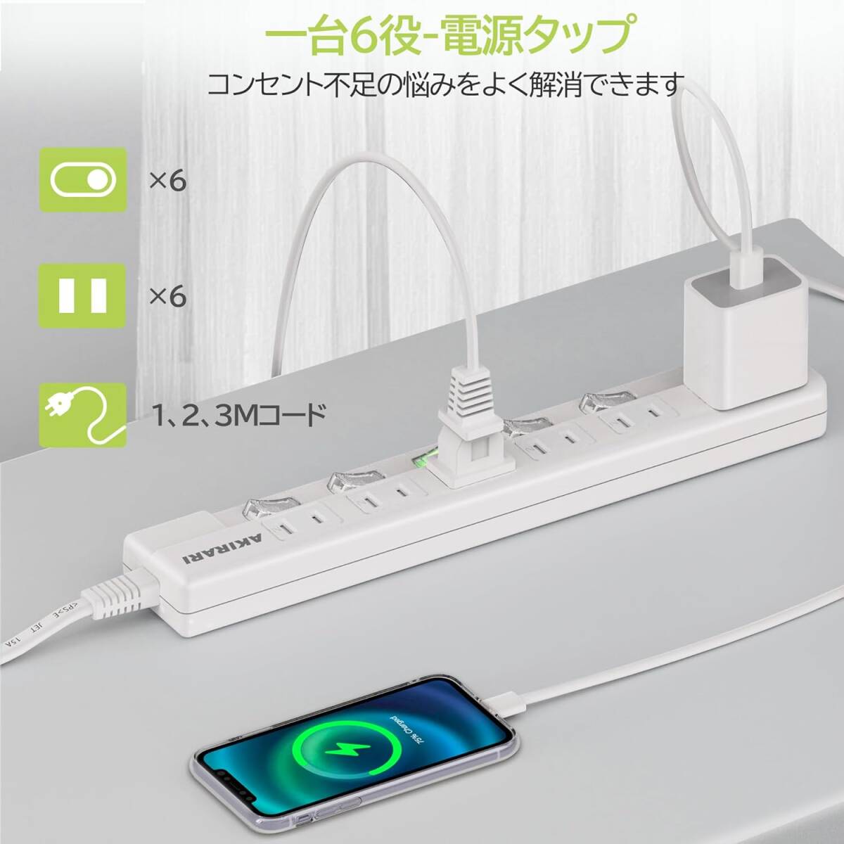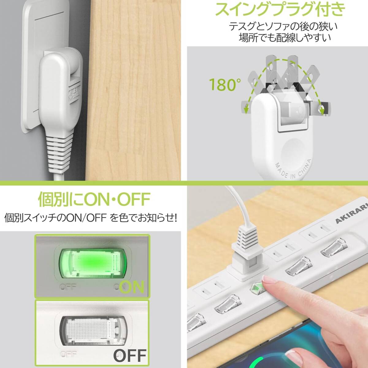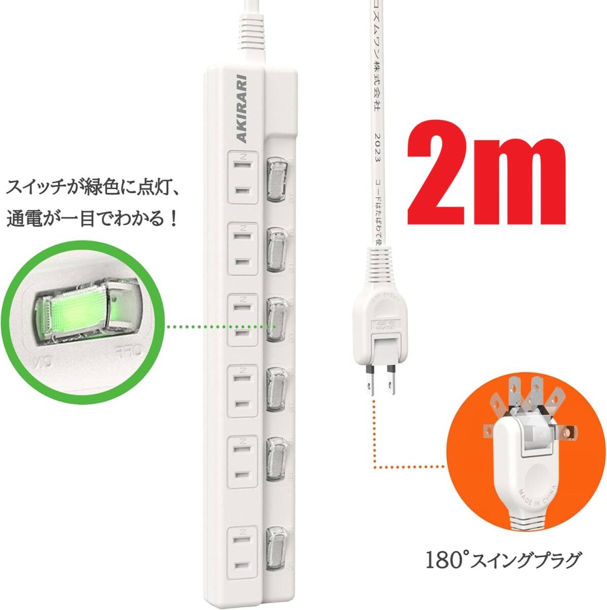 2m 電源タップ AC 延長コード 個別スイッチ AKIRARI 6個口 雷ガード ほこりシャッター コンセント 180度スイングプラグ