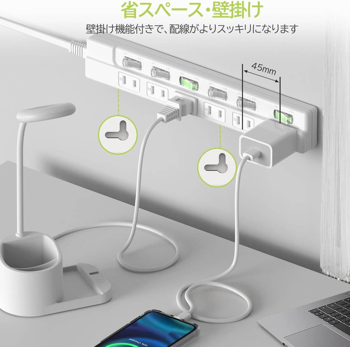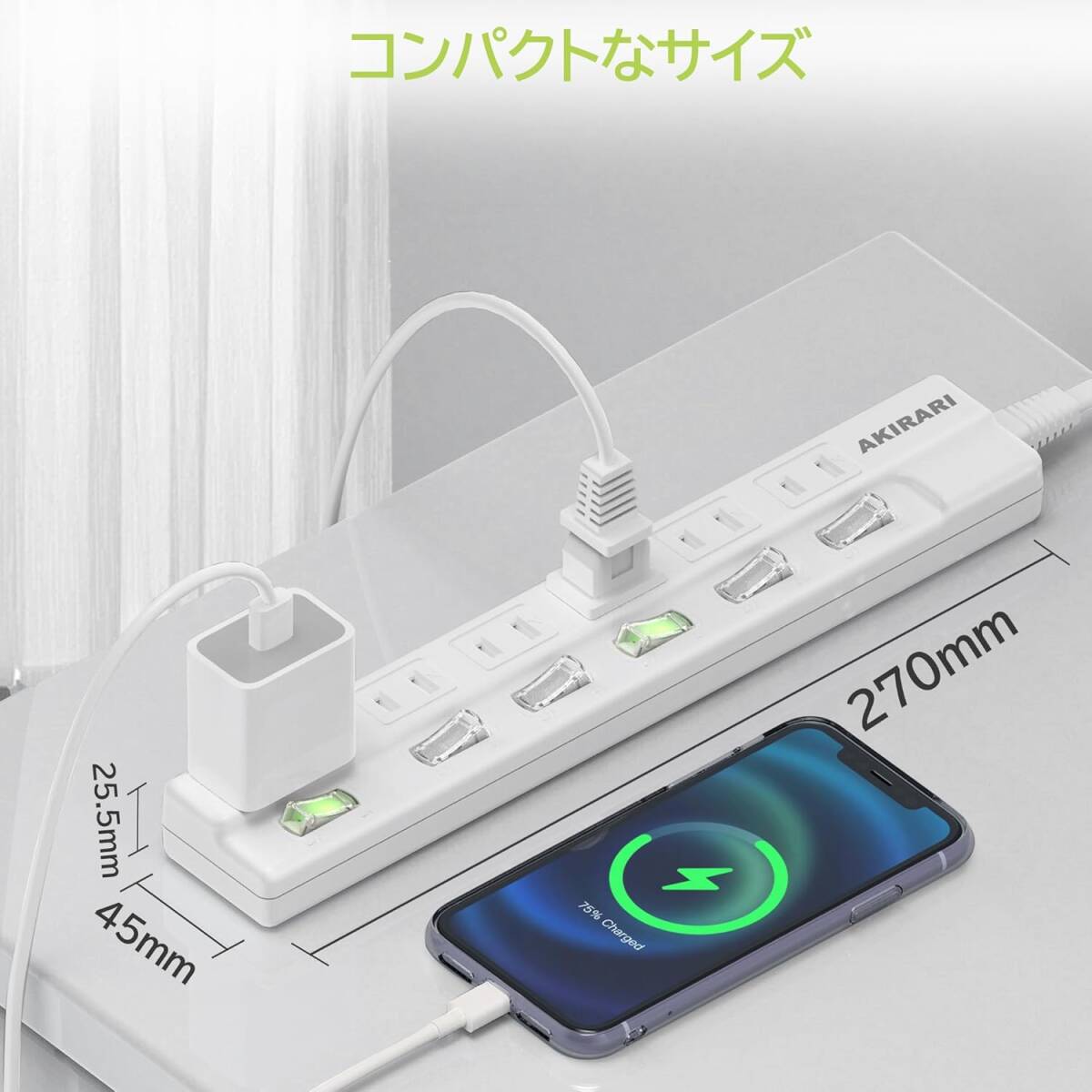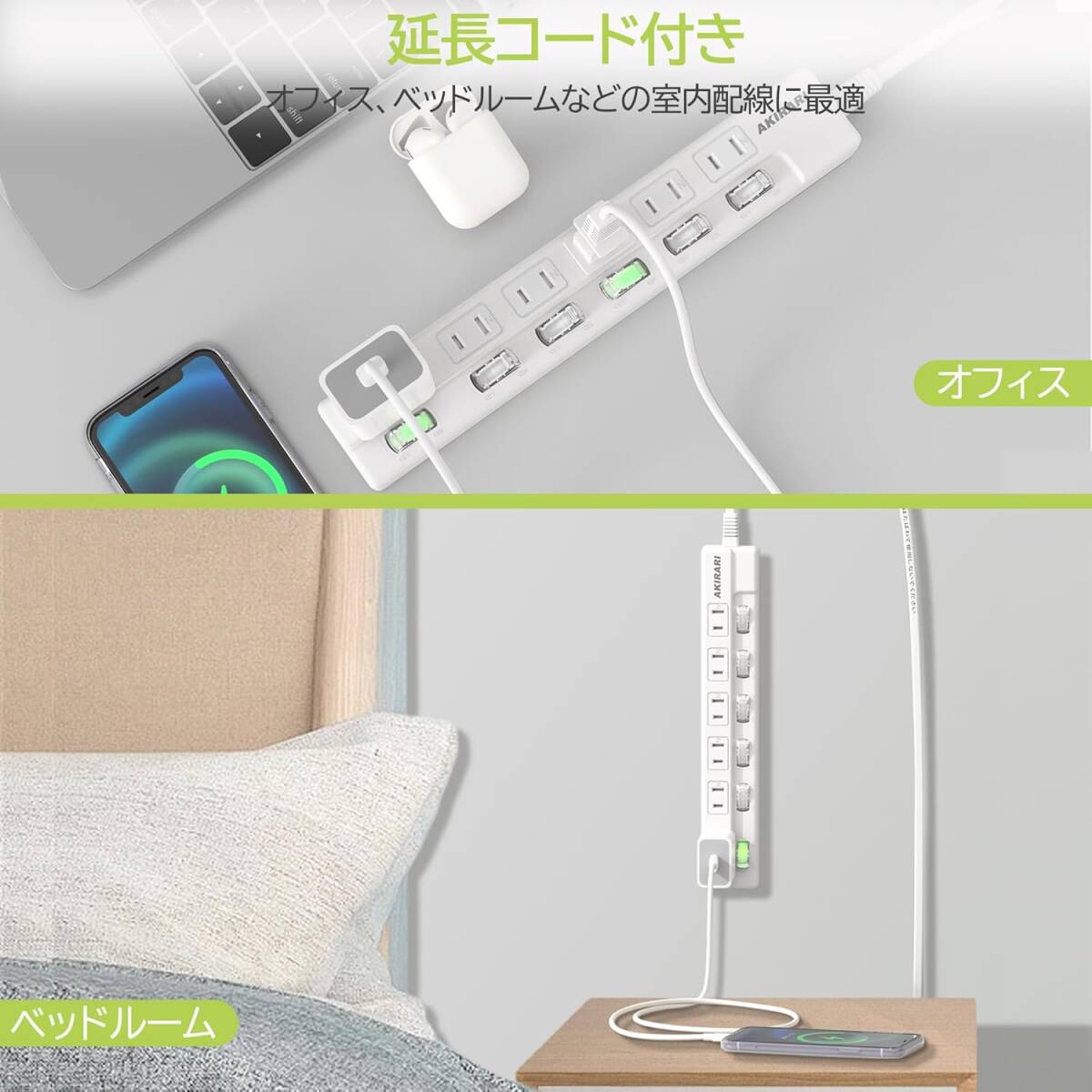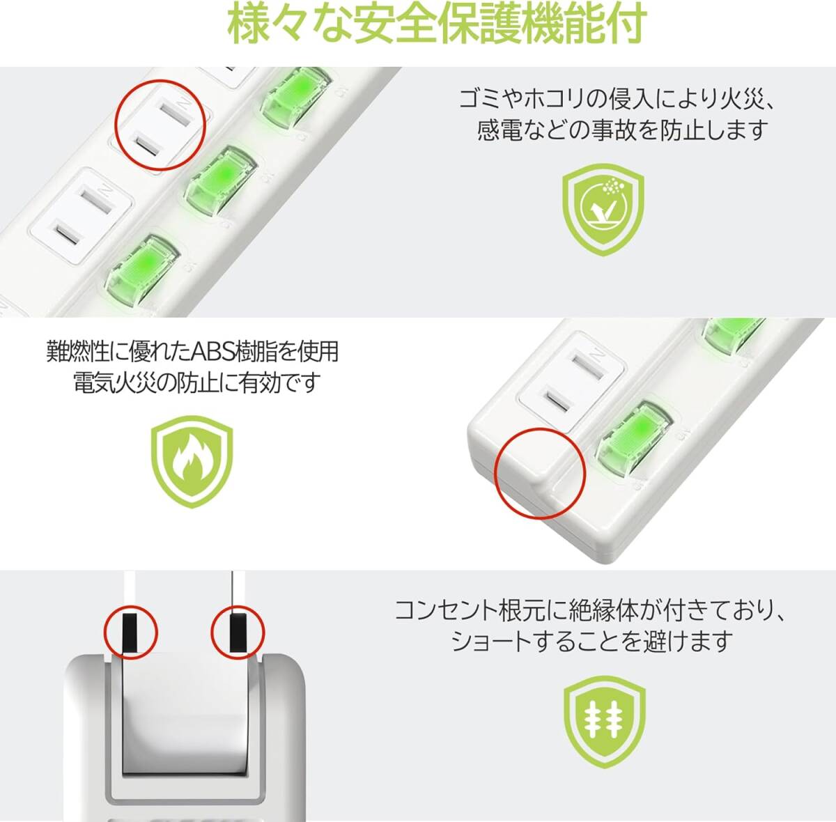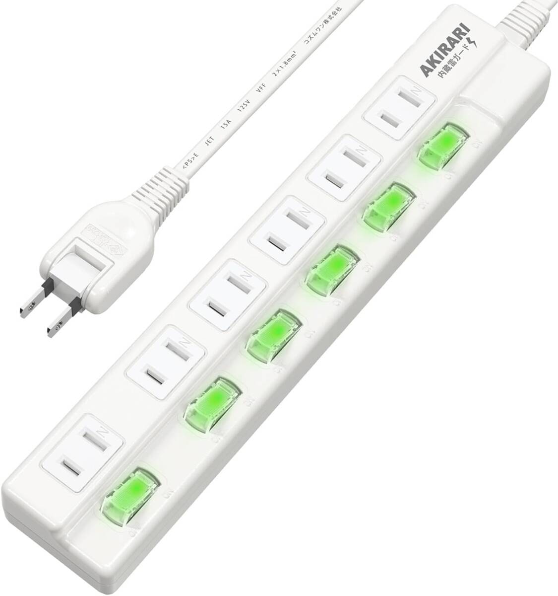 2m 電源タップ AC 延長コード 個別スイッチ AKIRARI 6個口 雷ガード ほこりシャッター コンセント 180度スイングプラグ