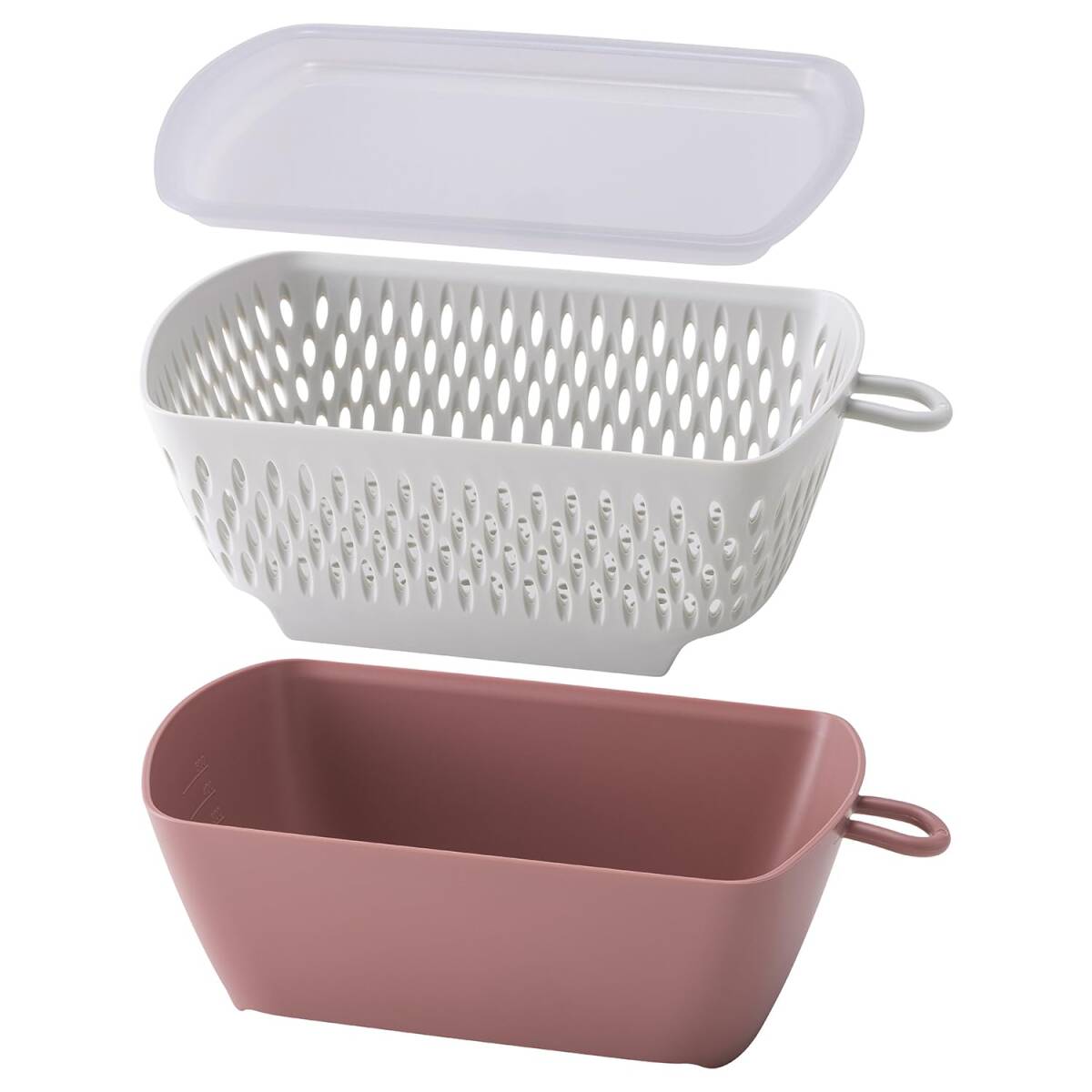 バットのフチのエッジで、切った食材をすくい取れる。電子レンジ対応で簡単調理。 コンパクトに重ねてしまえる、バット・ざる・フタのセット。