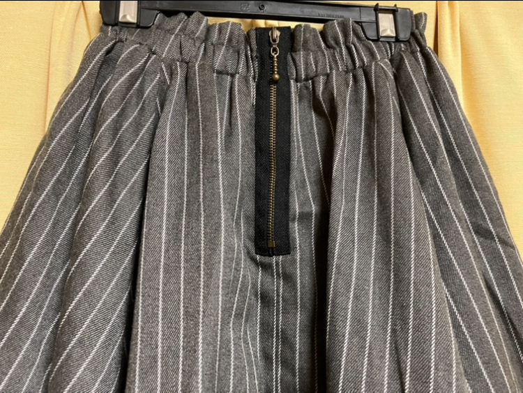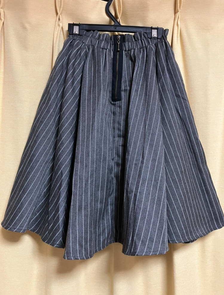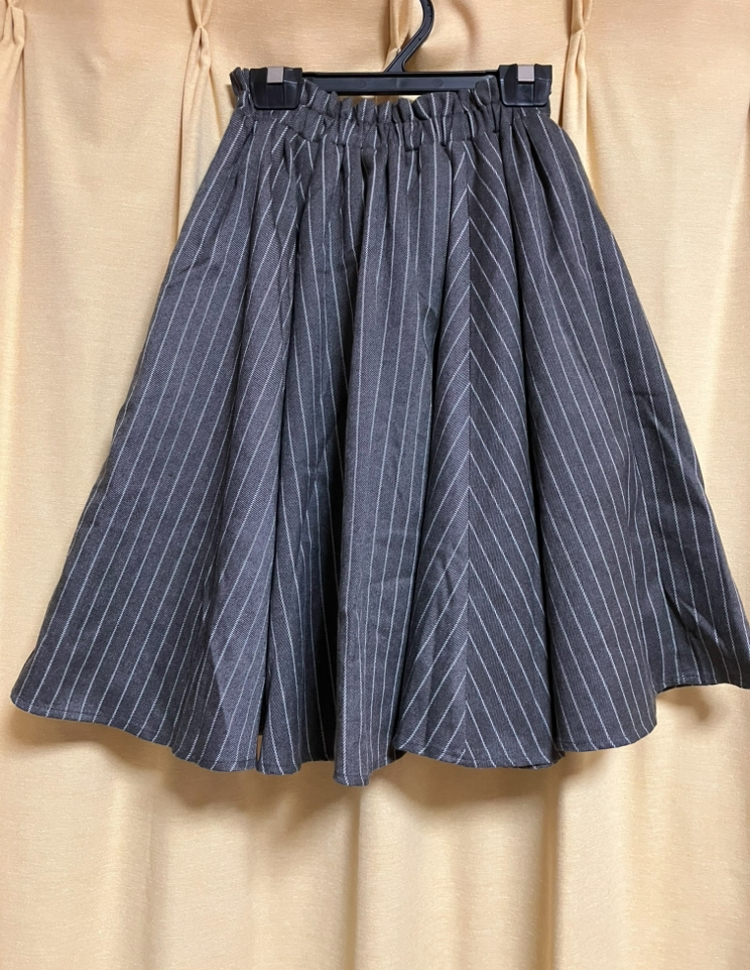 グレー×白のストライプ柄の落ち着いていたデザインのフレアスカートです。
