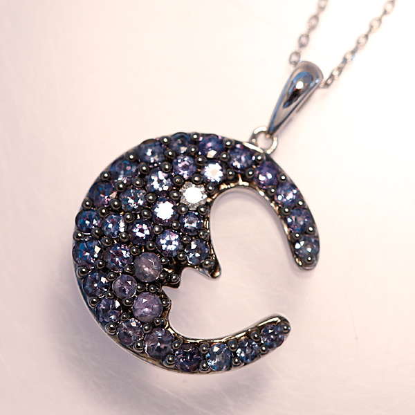 コメントシックな色合いのアレキサンドライトがきらめく、月の横顔をデザインしたユニークな雰囲気のネックレスです。カラーチェンジする様子が、ミステリアスな印象を高めてくれます。