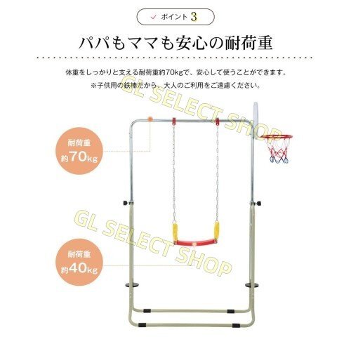• 【季節や天候を気にせずに楽しくおうちで遊びながら運動!】 01 ひとり乗りのブランコとしてお楽しみいただけます。 02 ブランコを外せば鉄棒に早変わり。前まわりも逆上がりも、おうちで楽しく練習できます。 03 バスケットゴ一ルを取付けて、ボ一ル遊びがお楽しみいただけます。