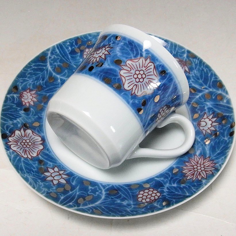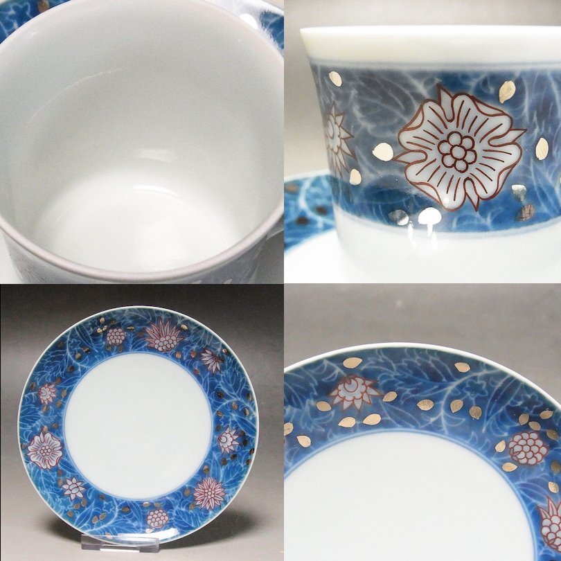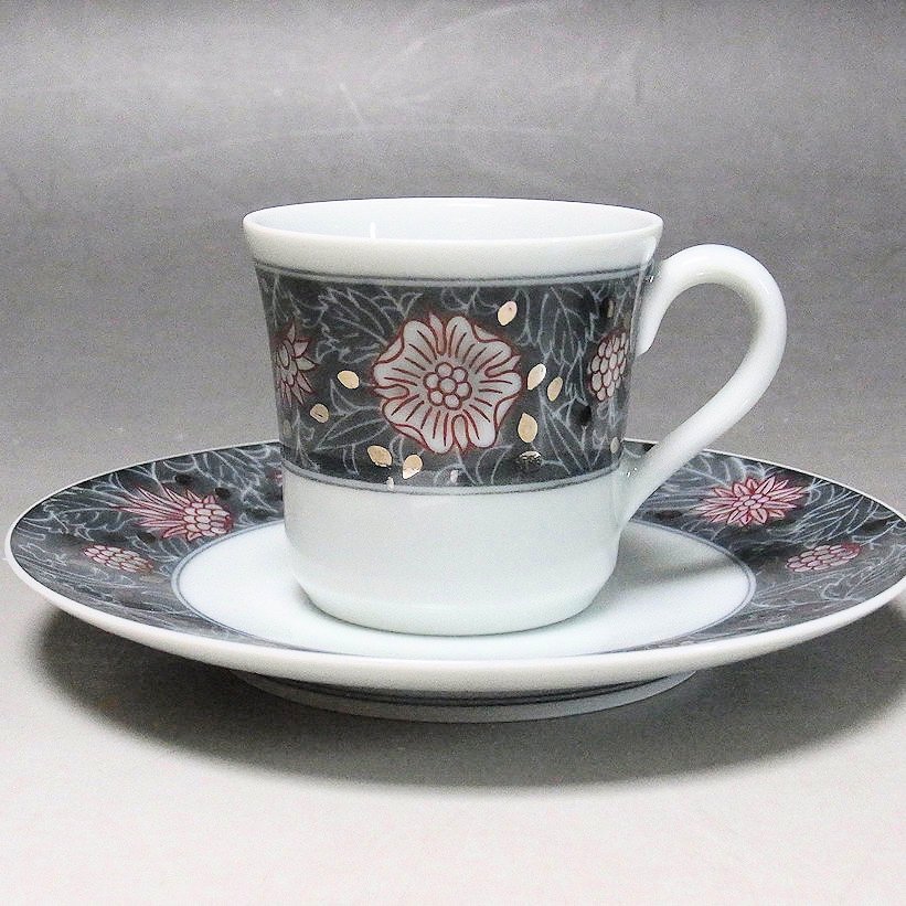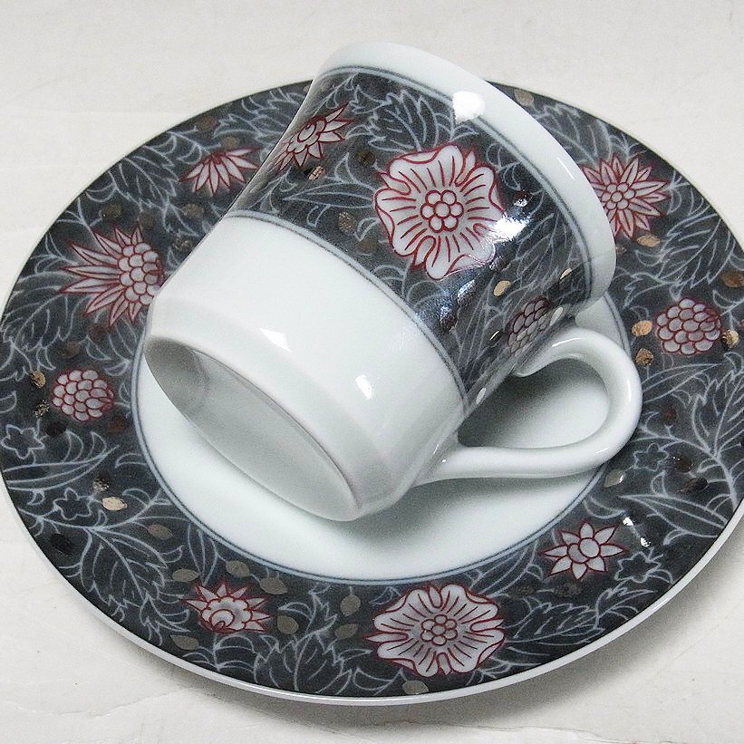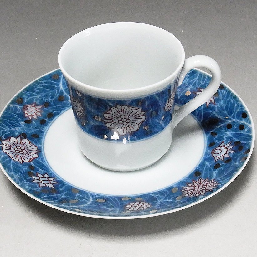 | 斉藤商店★人間国宝 14代 今泉今右衛門 色絵 黒色 藍色 墨はじき プラチナ彩 草花文 珈琲碗 2客 共箱★本人作デミタス |
