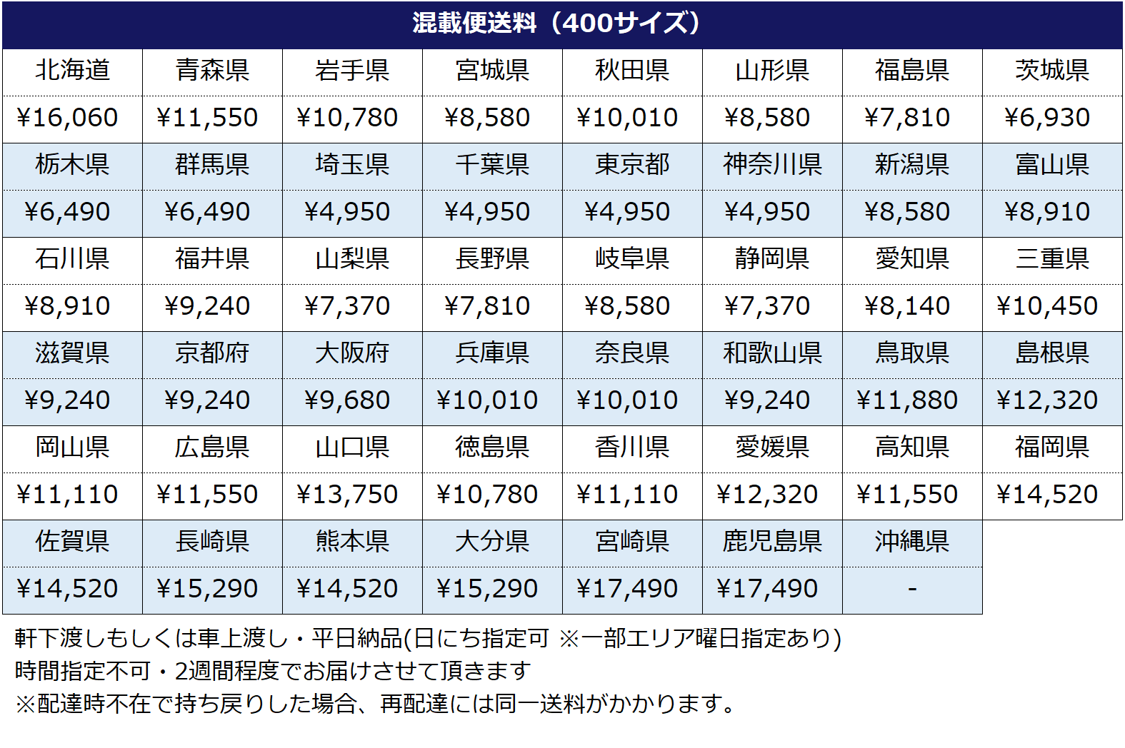 ※離島等の場合、配送可否含めて確認させていただきます。 ※同梱発送について… 同梱発送は、できる範囲で対応させて頂いております。 同梱したものが170サイズを超える荷物はそれ以外の混載便にて発送とさせて頂きます。 家具など大型商品は配送事故防止の為、同梱発送は行っておりません。 ※大量購入の場合、自社配送、トラックチャーター手配や搬入設置手配、耐震施工手配、養生手配などご相談ください。 |