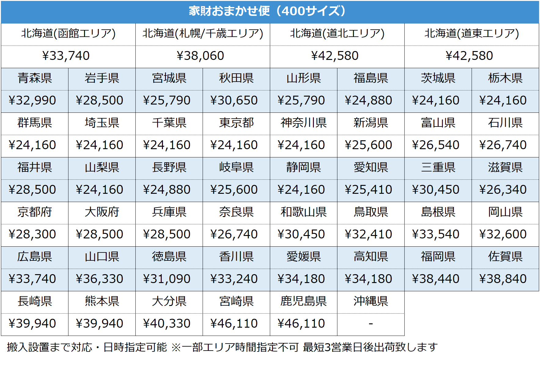 以下配送方法をご案内させて頂きます。 ご落札金額(税込み)+送料の合計をお支払下さい。 ※複数点ご購入の場合、落札数量×都道府県別料金=送料金額となります。 |