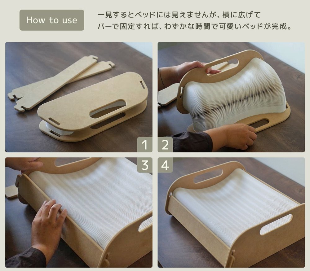 一見するとベッドには見えませんが、横に広げてバーで固定すれば、わずかな時間で可愛いベッドが完成。