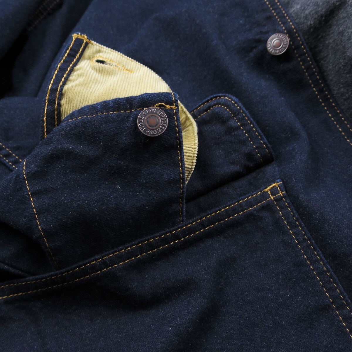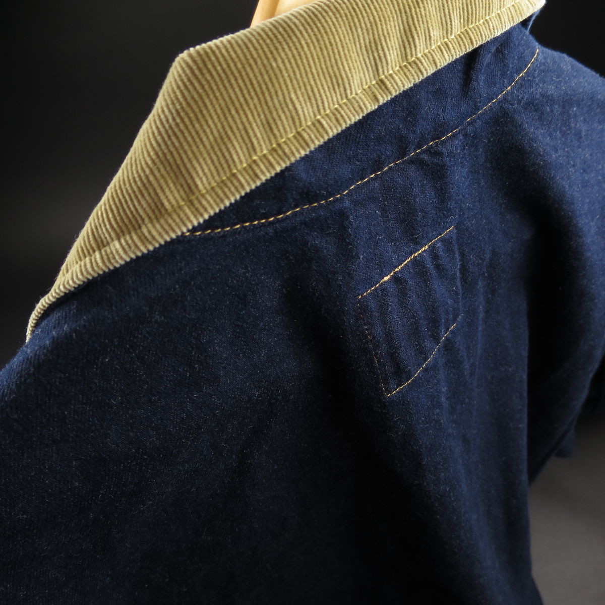 ■ 歴史を感じさせるシンプルなコートは大きなフロントポケットや胸ポケット、4つのボタンをあしらい、丈夫な混紡ファブリックを使用。