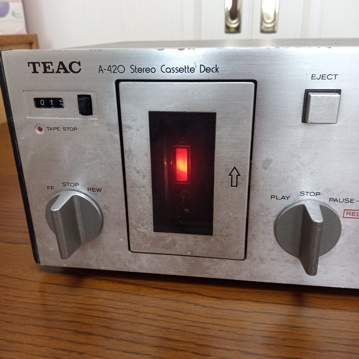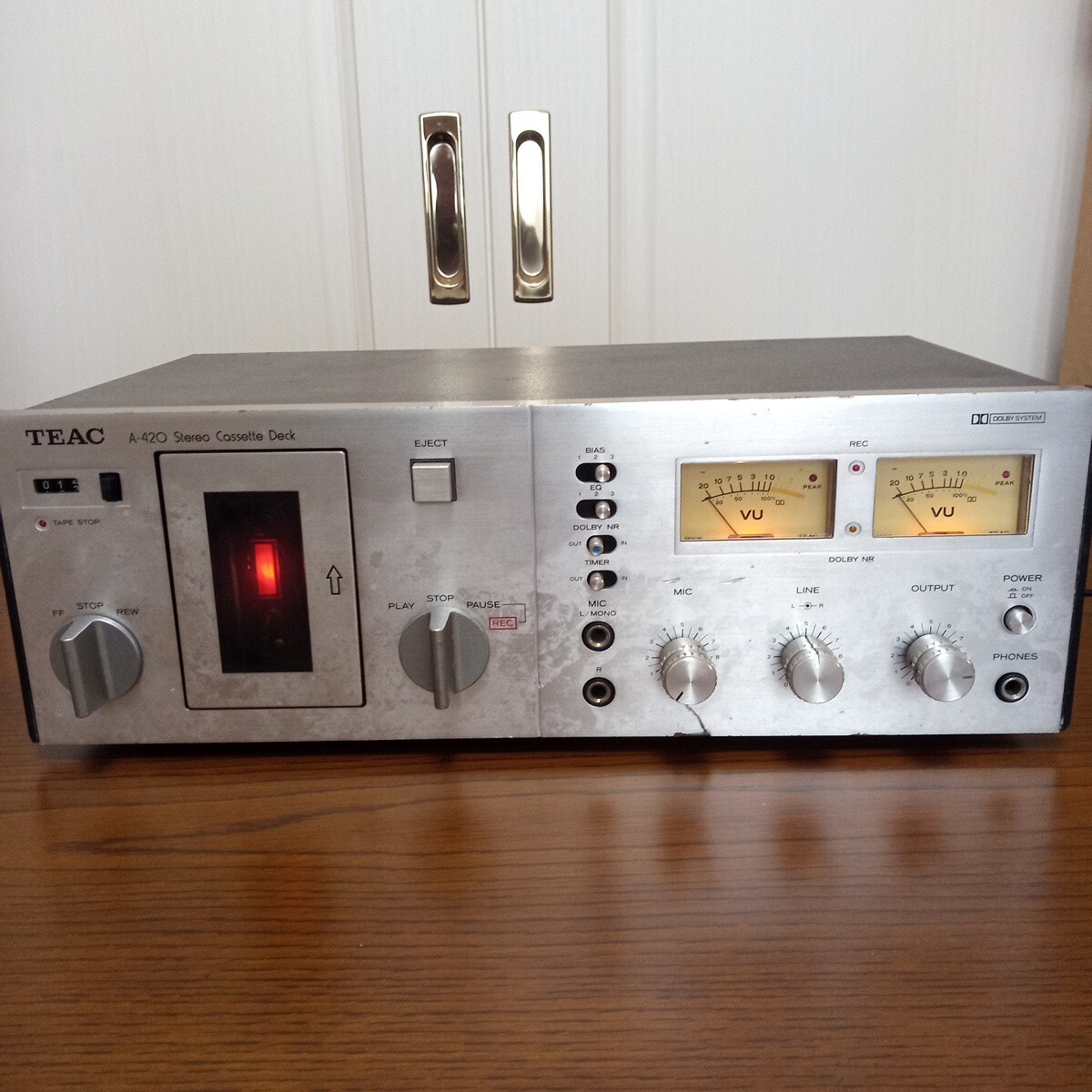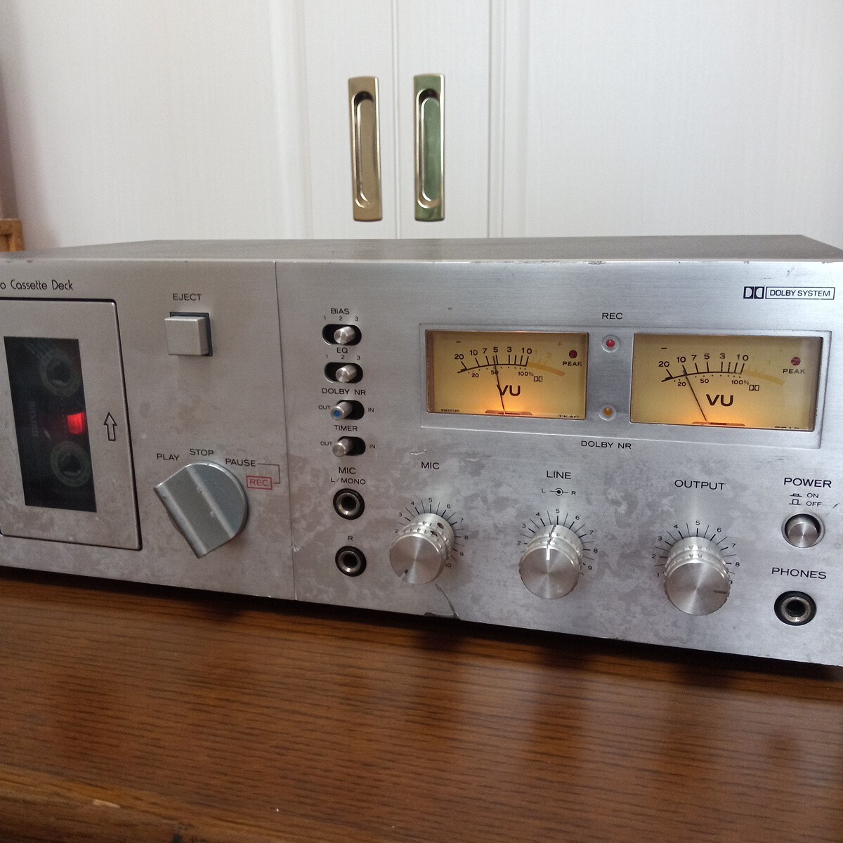 不動品を入手して修理して使用していたものです。修理箇所は全ベルト交換、モーター台座修理(ゴムが朽ちてモーターが外れかけてました)、録音再生レベル調整、カウンターリセットボタン修理、速度調整、アジマス調整、などです。