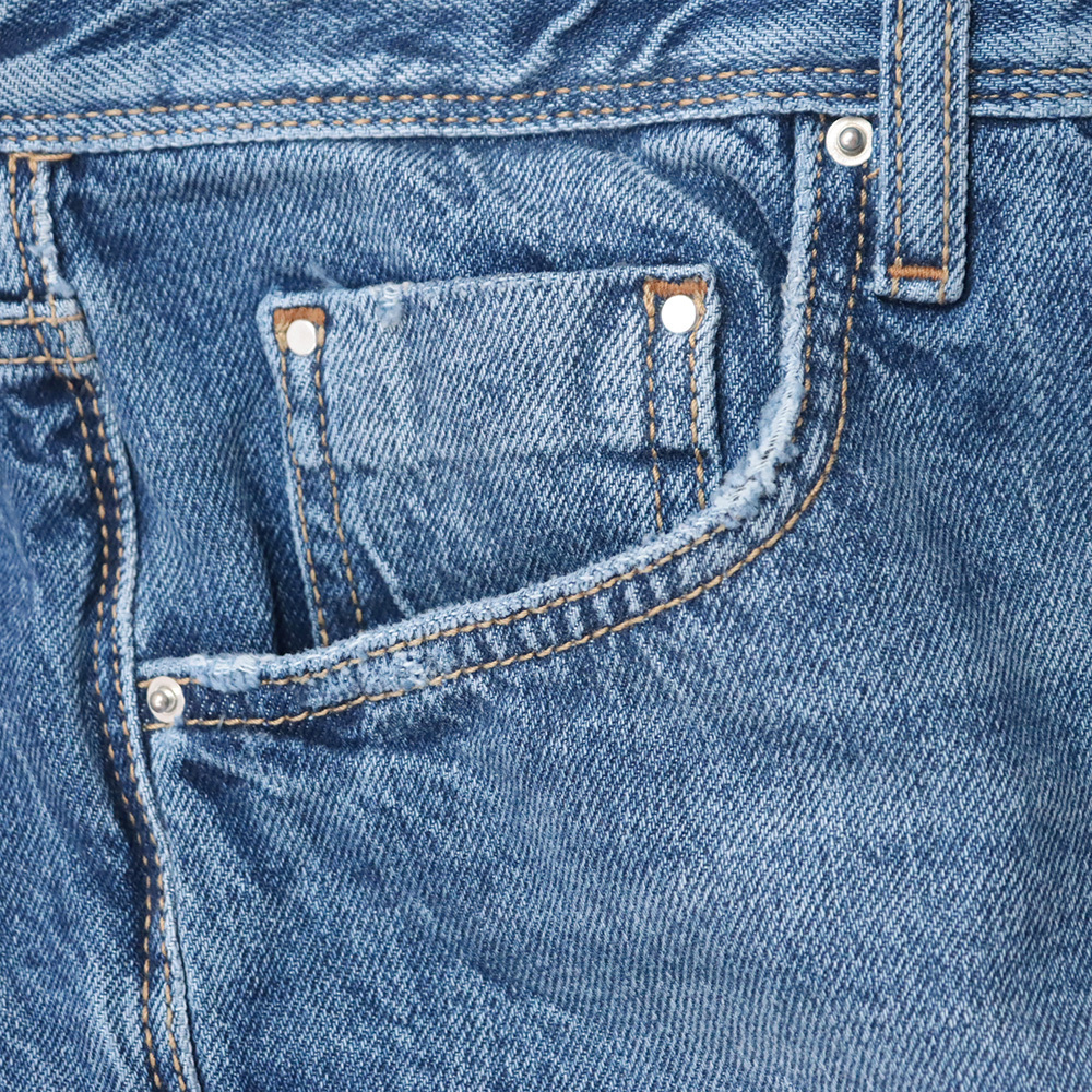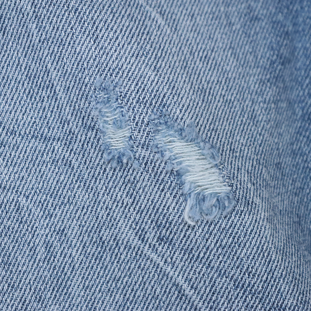 素材には綿100%の上質なデニムを使用。ナチュラルなウォッシュ加工と計算されたダメージディテールが、程よくこなれた雰囲気を演出します。