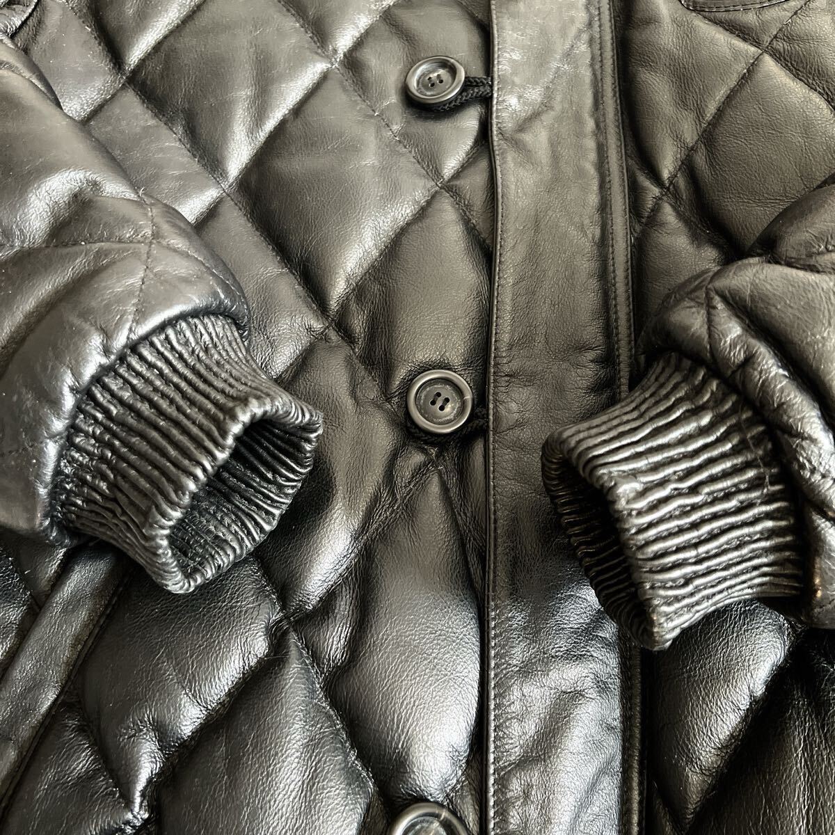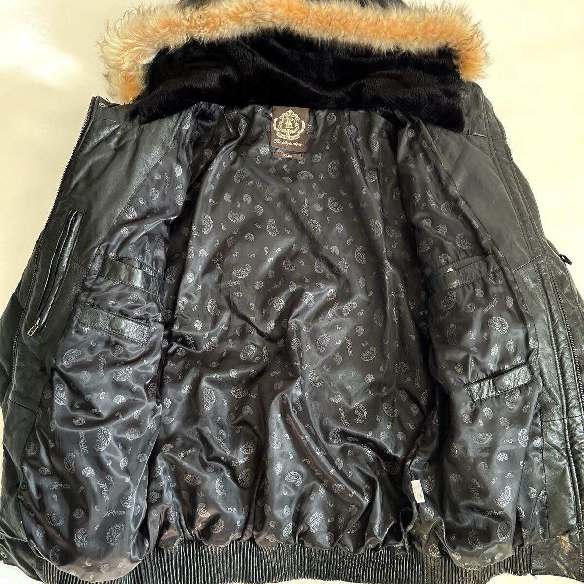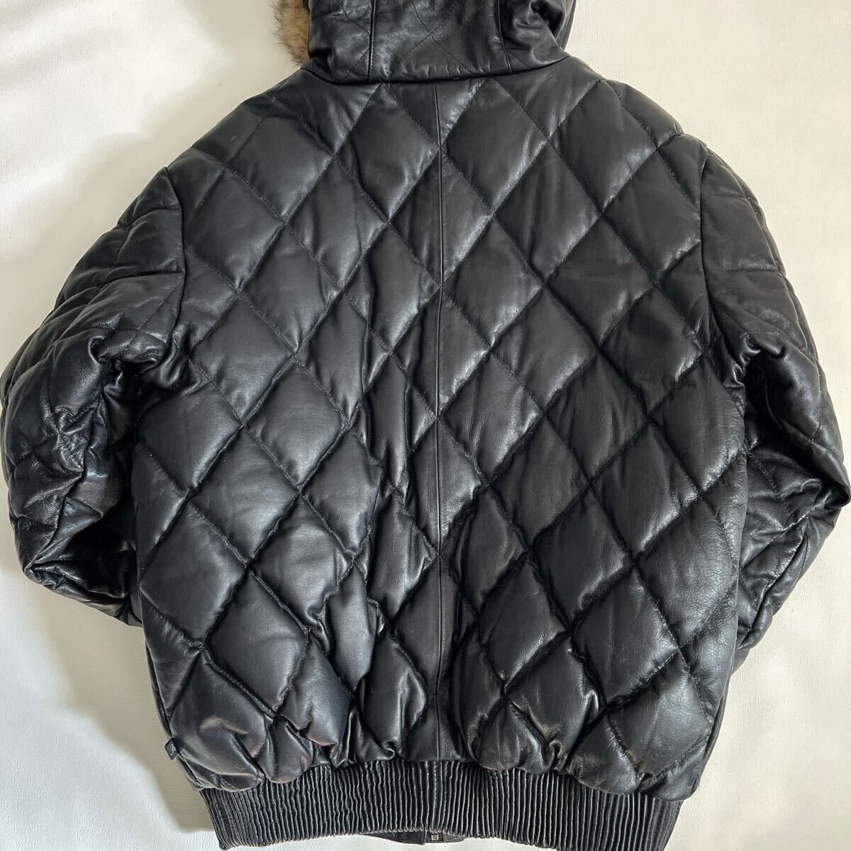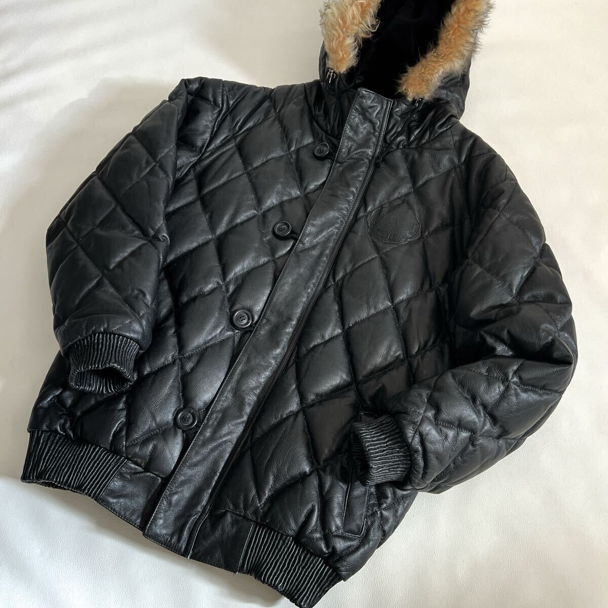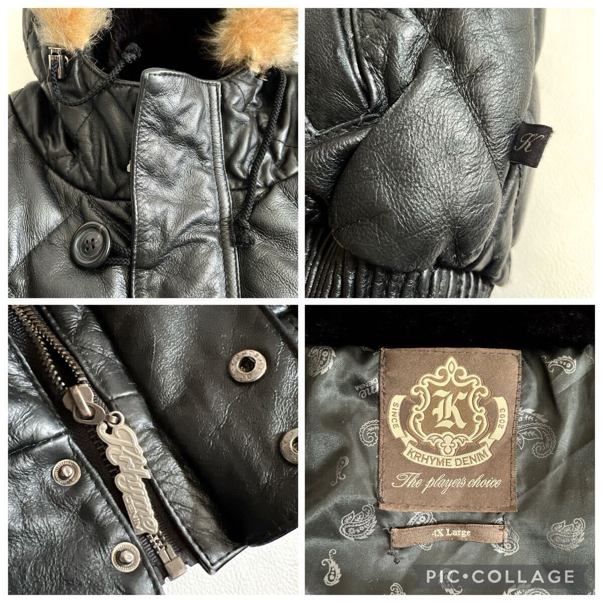 KRHYME DENIM クライムデニム カウレザージャケット 牛革 ダウン フェザー キルティング ダイヤキルティング 本革 ファーフード 4XL ブラック 黒 フードは取り外し不可です。