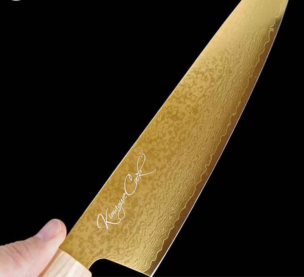 刃物の名産地・岐阜県関市の伝統を受け継ぐ職人が、一本一本手作業で仕上げたこだわりのオリジナル包丁。69層ダマスカス鋼が生む美しい波紋に、宇宙開発技術を応用したイオンプレーティング加工でゴールドの輝きをまとわせています。