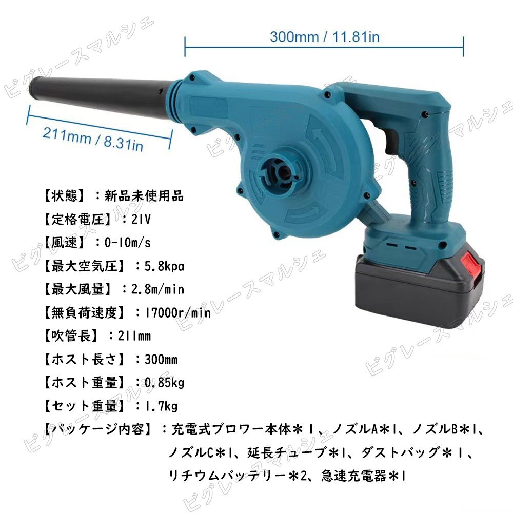 【パッケージ内容】:充電式ブロワー本体*1、ノズルA*1、ノズルB*1、ノズルC*1、延長チューブ*1、ダストバッグ*1、リチウムバッテリー*2、急速充電器*1