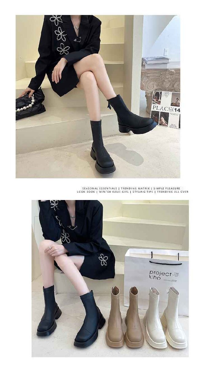 レディース 靴 ブーツミディミドル ショート スクエアトゥ バックファスナー マット 厚底 脚長 40 ベージュ