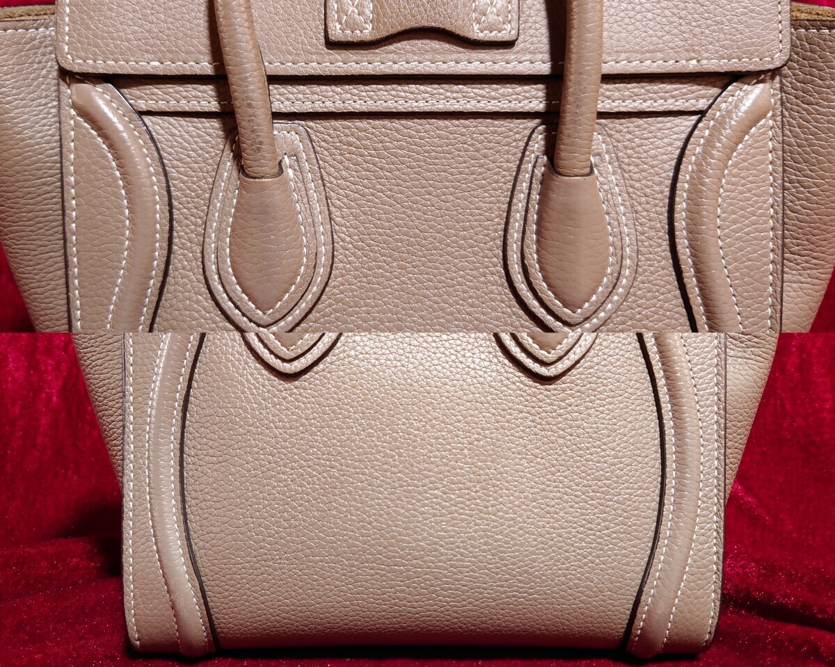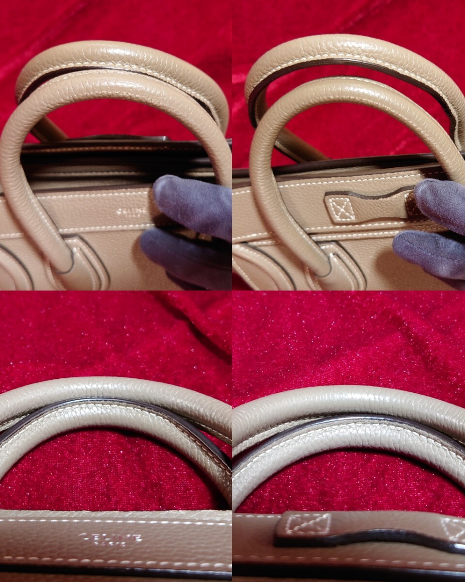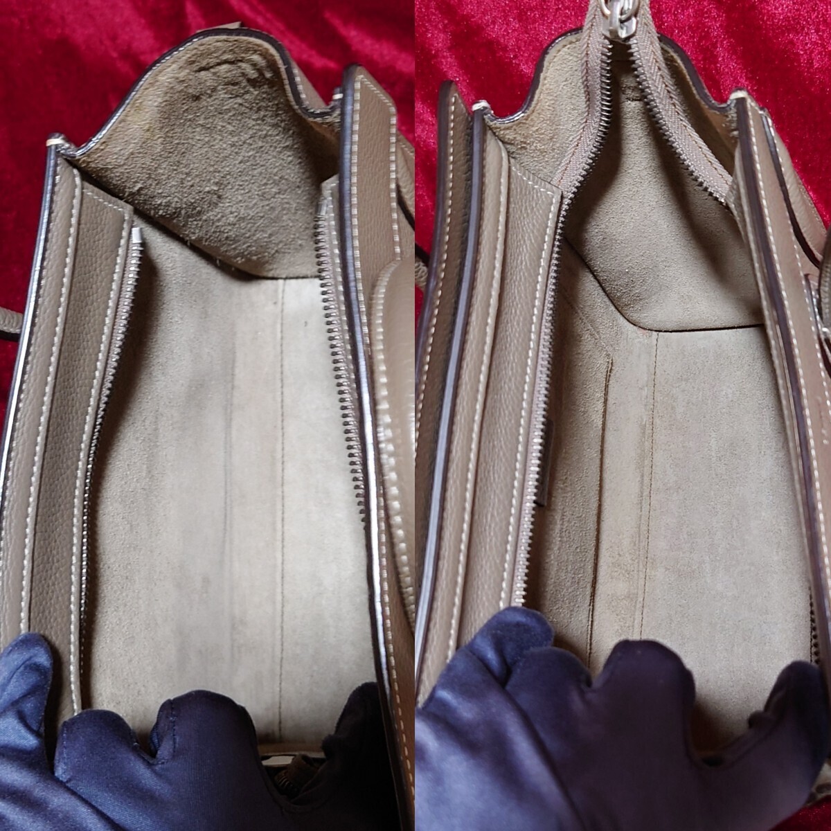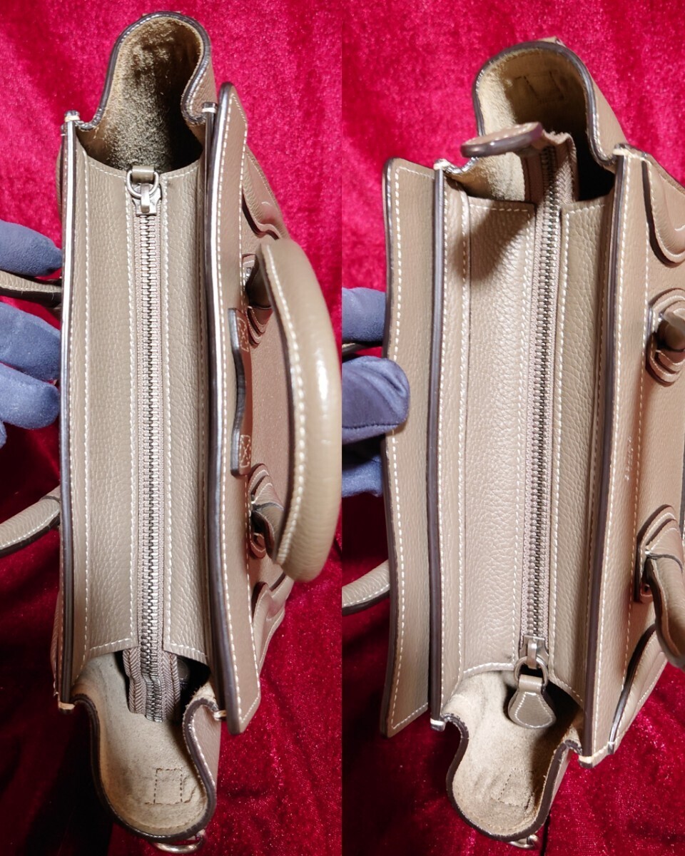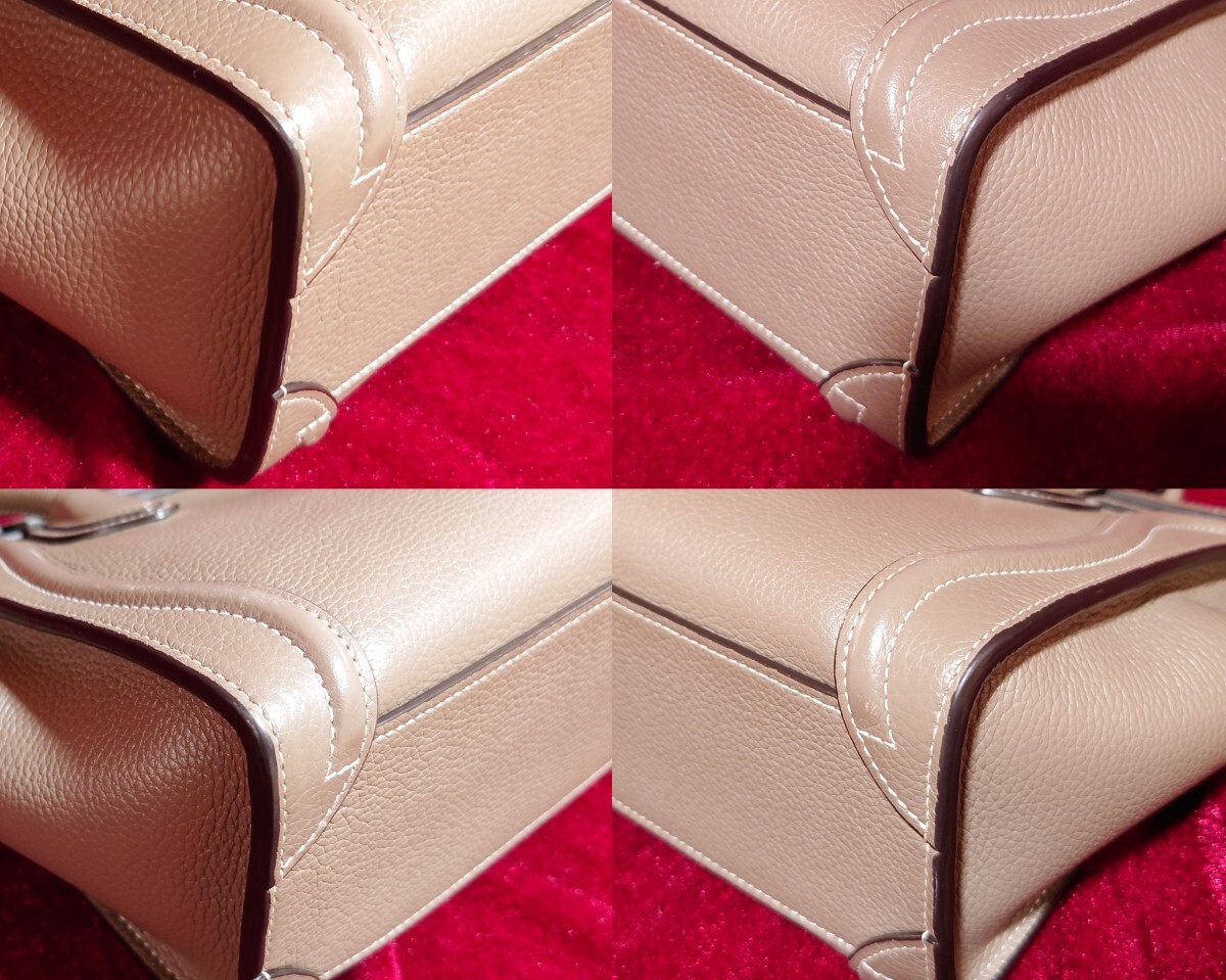 底付近に擦れによる微細な色落ちがありますが、目につくダメージは無し。革自体は張りがあり、型崩れもほぼ無い状態で非常に良好。
