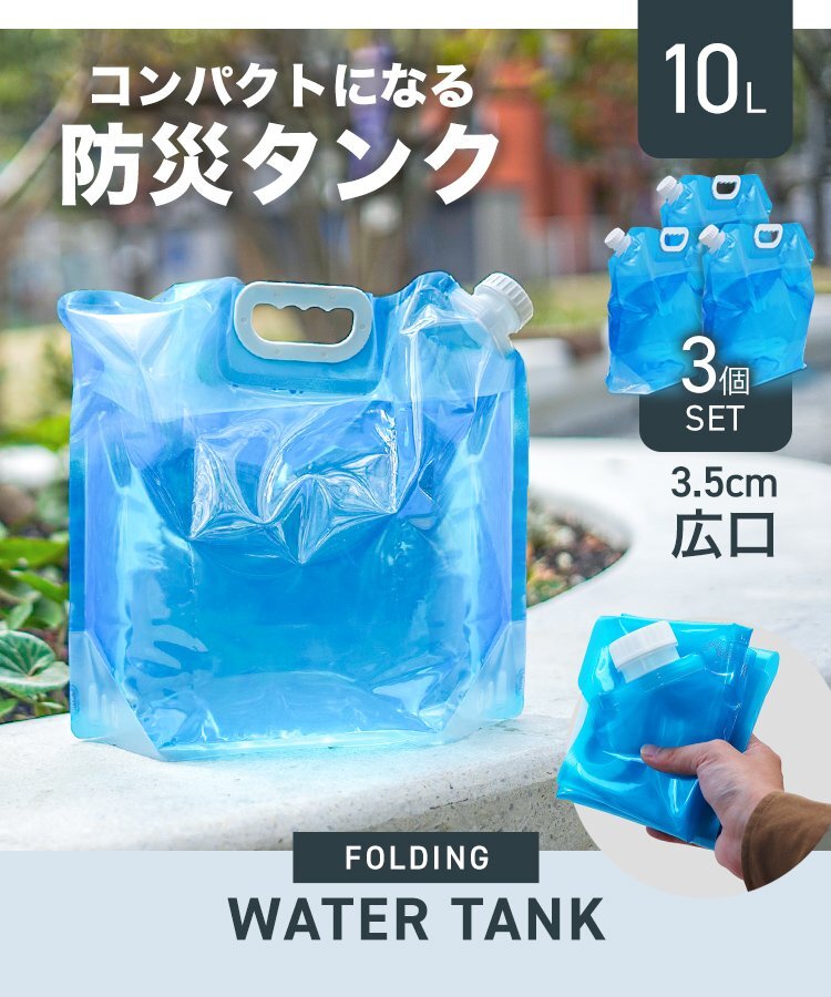 折り畳めるマチ付きウォータータンク 10L×3個セット 災害時・アウトドア・レジャーなど様々なシーンで大活躍! ■安心の大容量 給水所での水の確保に最適な大容量10L! 複数使いで水の使い分けも可能です。 ■丈夫な3層構造 しっかりした3層構造で耐久性抜群!繰り返しの使用も安心。 ■折りたたみ可能 小さく畳んでコンパクト収納、持ち運びもラクラク♪ ■注ぎやすい広口設計 開口部約3.5cmと広いので水を注ぎやすく、こぼれにくい。 水の補充や中の洗浄も簡単! ■疲れにくい持ち手 持ちやすく握りやすいハンドル形状なので、 指にフィットして長時間でも疲れにくい設計です。 ■マチ付き&自立可能 地面に置いてもしっかり自立!注ぎ作業も安定してできます。 ■残量が見えやすい半透明 外から中身の確認ができるため、補充のタイミングがわかりやすい◎ 【使用シーンいろいろ】 ・防災グッズとして非常用の備えに ・キャンプ、登山などアウトドアに ・スポーツや運動会などの給水に ・ガーデニング、洗車用の水確保にも 【商 品 詳 細】 容量10L サイズ 本体:(約)40.5×37.5×16.5cm カラー 表:クリア 裏面:ブルー 素材 ポリエチレン ナイロン ペット (ウォータータンク 蛇口 水 防災 アウトドア 10L 15L 20L レジャー ビーチ 給水 バーベキュー キャンプ テント レバー式コック 取っ手 ウォータータンク 折りたたみ式 防災グッズ 給水袋 ポリタンク 給水用品 給水タンク キャンプ用品 キャンプ BBQ レジャー アウトドア 屋外 登山 車中泊 川遊び 山 便利グッズ) |