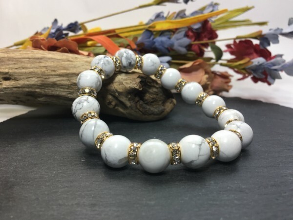 こちらは、12mm玉のハウライトを使用した天然石ブレスレットです。石との間にはロンデルを挟み高級感を演出しています。シンプルなデザインですのでどんなコーディネートとも合わせ易いブレスレットです。石大きさは12mm玉です。内径約18cmです。(サイズ変更の場合は取引ナビにてご連絡をお願いします。) 数に限りがございますので気になる方はお早めにどうぞ。