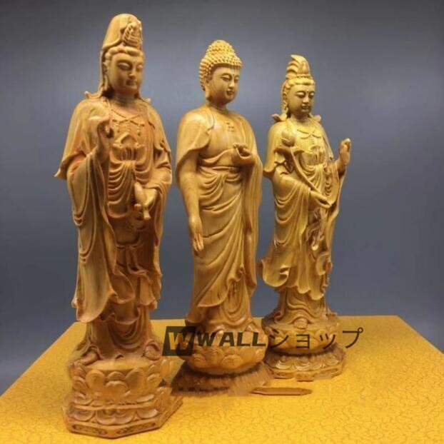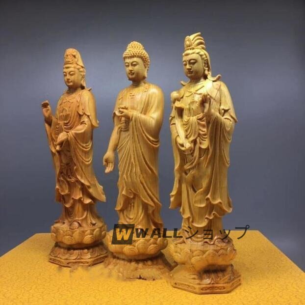 ★極上の木彫仏教美術 阿弥陀如来三尊立像 観音菩薩 木彫仏像 精密細工 高さ約20cm
