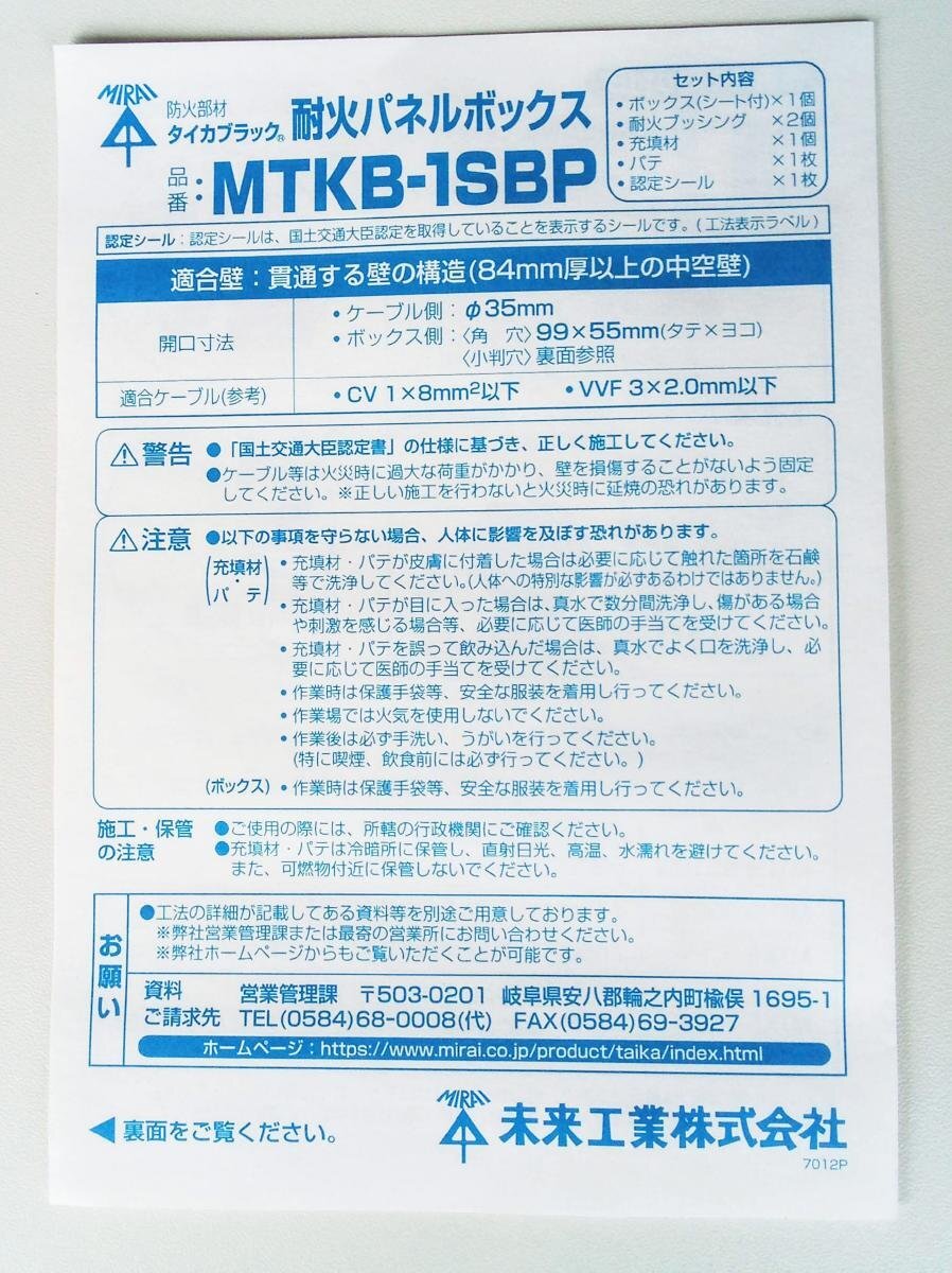 | ▼商品名 | [未使用品 2点セット] 未来工業 ミライ 防火部材 タイカブラック 耐火パネルボックス MTKB-1SBP [西那須野店] |