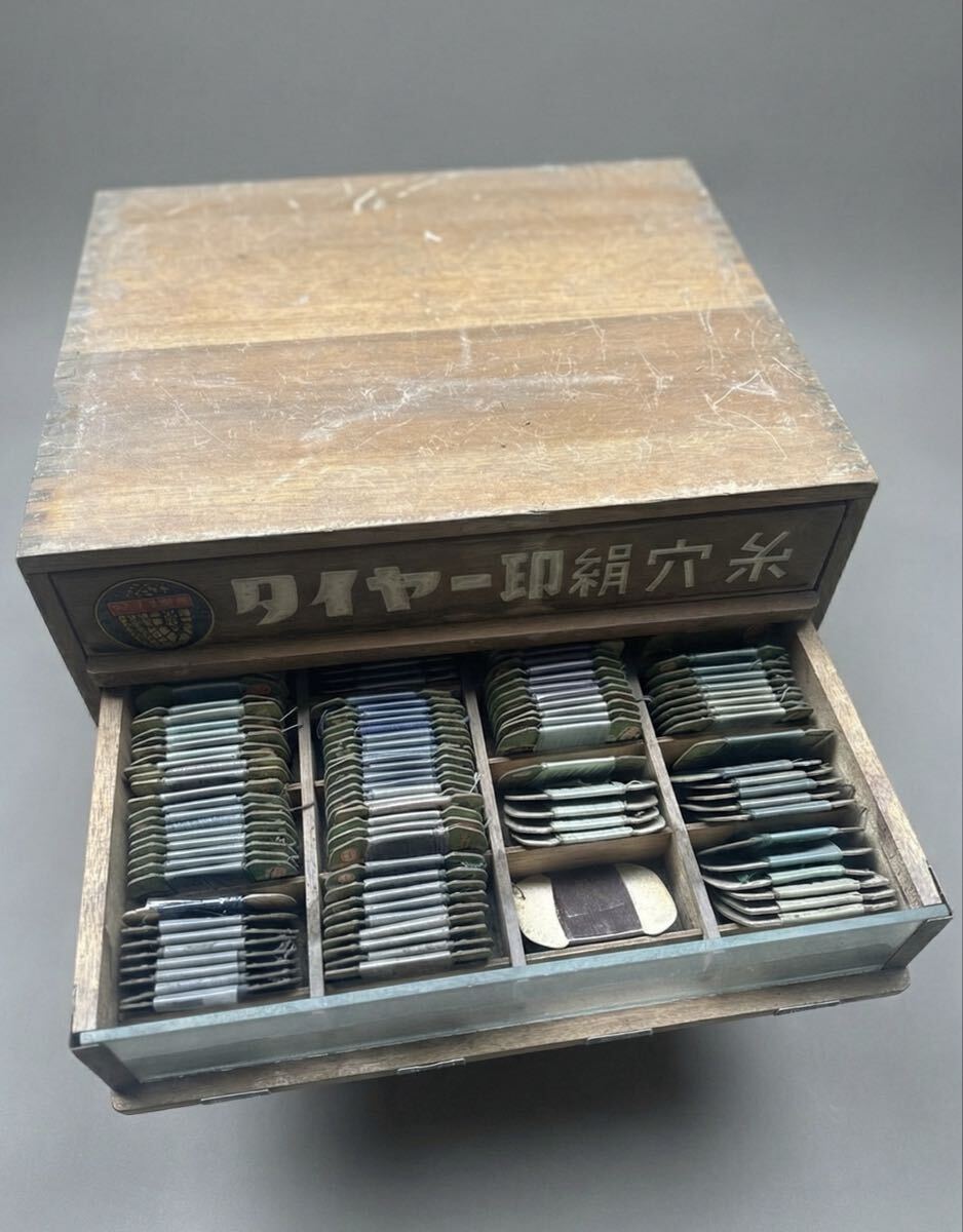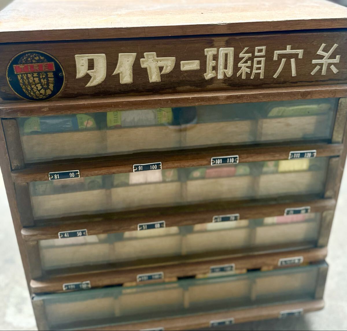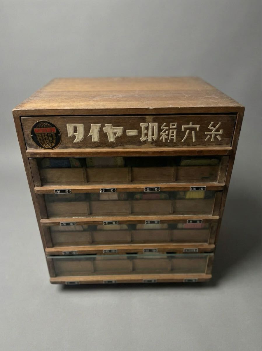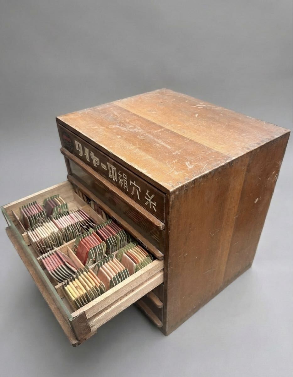 引き出しを開けると、昔懐かしい「カード巻き(紙に巻かれた状態)」の絹糸が詰まっており、当時の手芸店の空気がそのまま閉じ込められているようです。