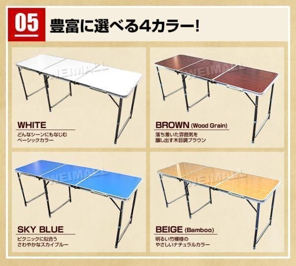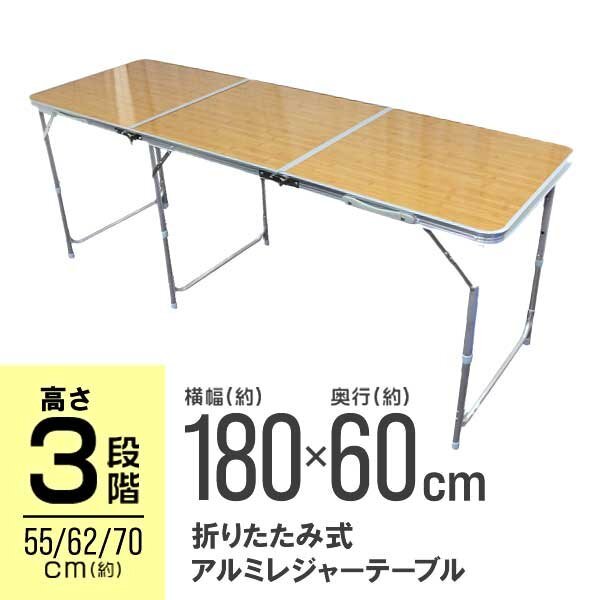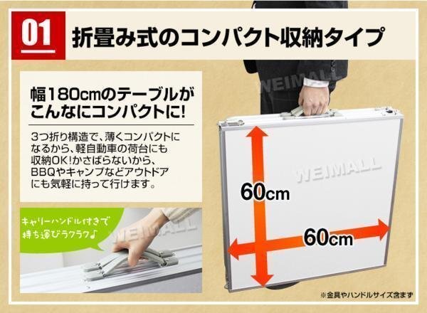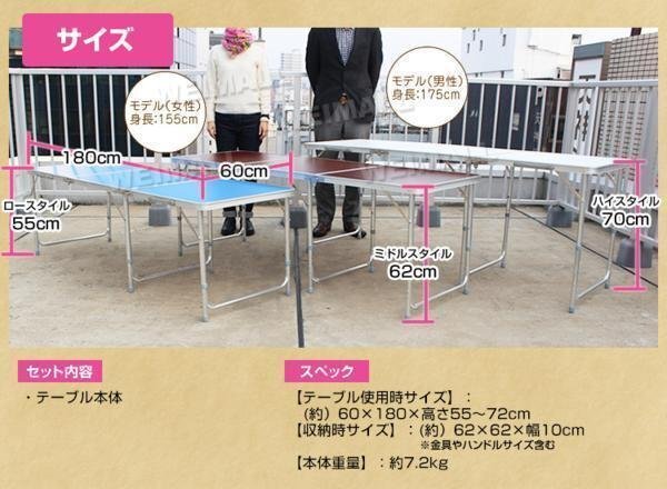 車のトランクに入れる時や持ち運びの際にもとても便利な取っ手付きで持ち運びもラクラク!! サビに強いアルミを使用。 天板には防水加工が施されています。 テーブルは3段階の高さ調節ができ、お好みのスタイルに合わせて「ハイスタイル」「ロースタイル」の2パターンでお使いいただけます。 キャンプ、バーベキュー、お花見などにとても便利。 気軽にアウトドアレジャーをお楽しみいただけます!! 【商品仕様】 折りたたみ式 テーブルサイズ(約):幅180cm×奥行60cm×高さ55cm/62cm/70cm ※高さ3段階調節 カラー:ベージュ 収納サイズ(約):幅62cm×奥行10cm×高さ62cm 耐荷重(約):20kg 重量(約):7.2kg 材質:アルミ、MDF(耐熱・耐水加工)、ポリエステル、スチール 【注意事項】 ・海外製品で、簡易梱包での輸入のため風防に擦れや多少の小キズなどがある場合がございますが、商品自体には問題ありませんのでご了承下さい。 ・商品は、モニターによって色合いが異なって見える場合があります。 ・仕様・デザインは改良のため予告なく変更することがあります。 【その他ラインナップ】 ・70cm ・90cm(ベンチ付き) ・90cm(4色選択・ベンチなし) ・120cm(イス付き) ・120cm(4色選択・イスなし) ・135cm(BBQタイプ) ・180cm(4色選択・イスなし) ・240cm(4色選択・イスなし) |