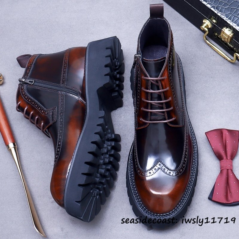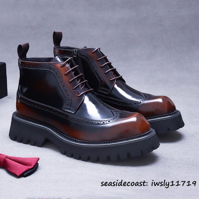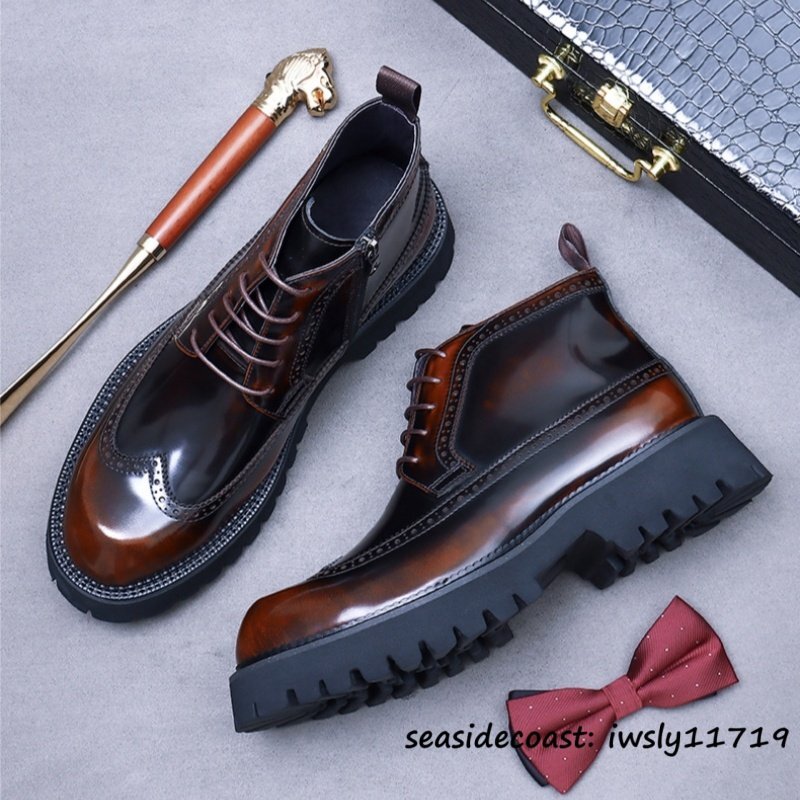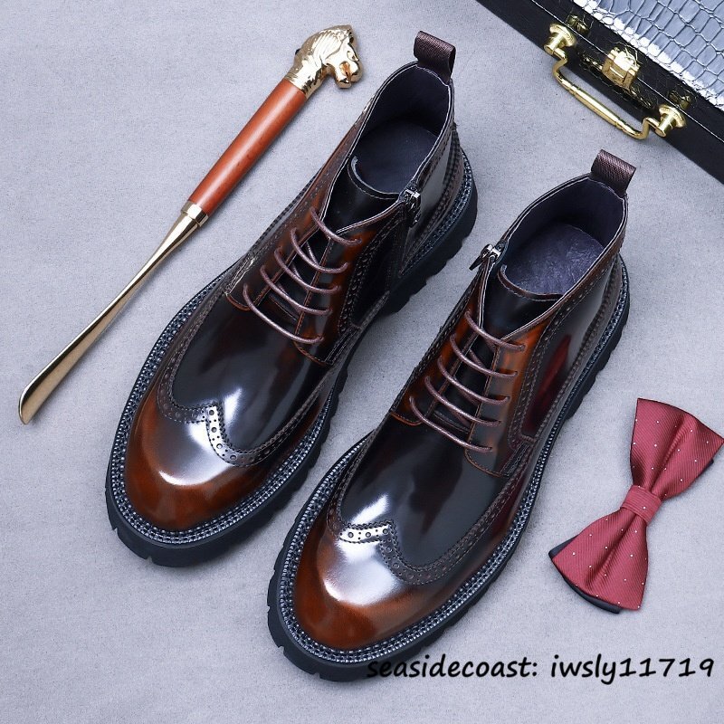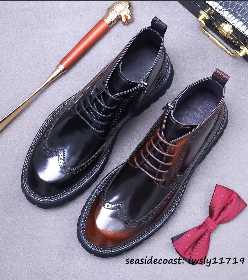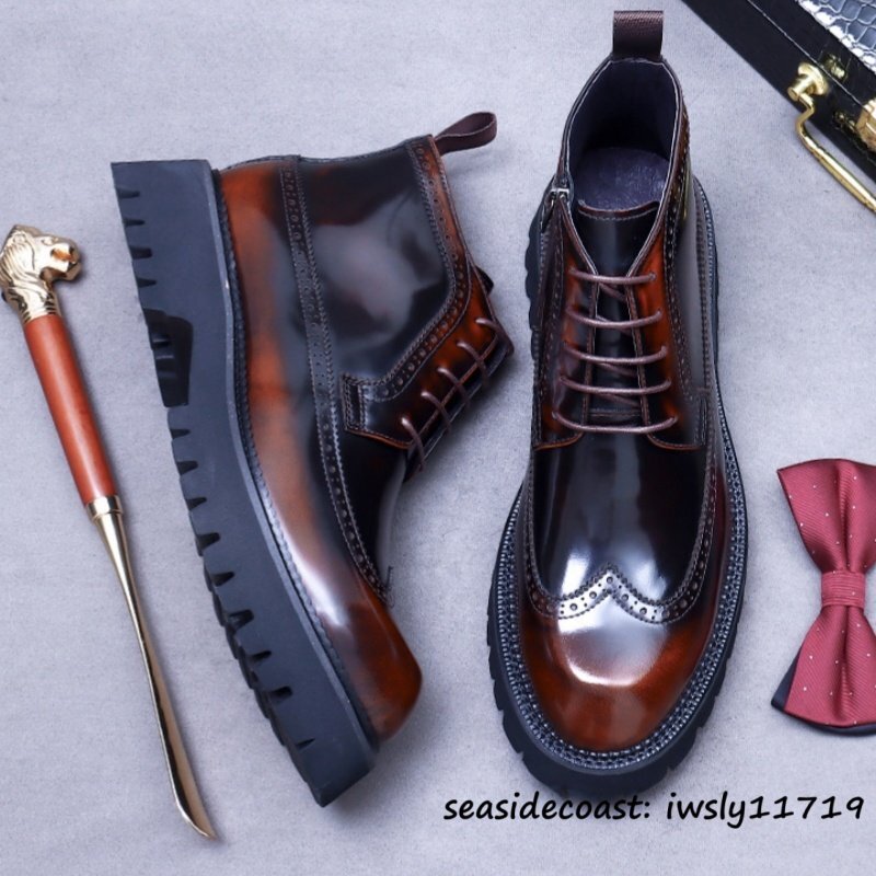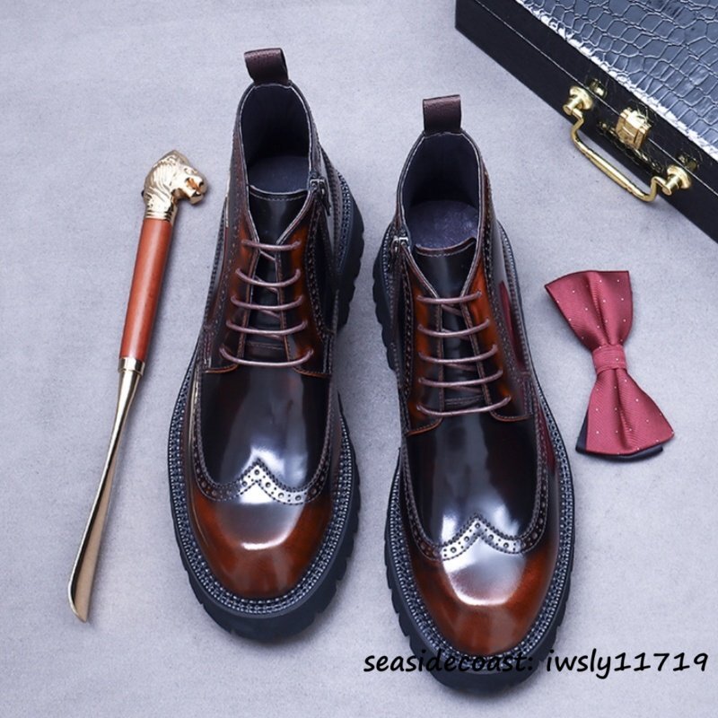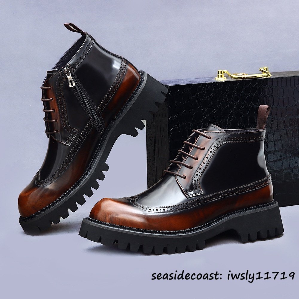 定価11万■高級牛革 レザーブーツ メンズ ブルーキング マーチンブーツ イギリス風 職人手作り 本革 ショートブーツ 厚底 ブラウン 25.5cm