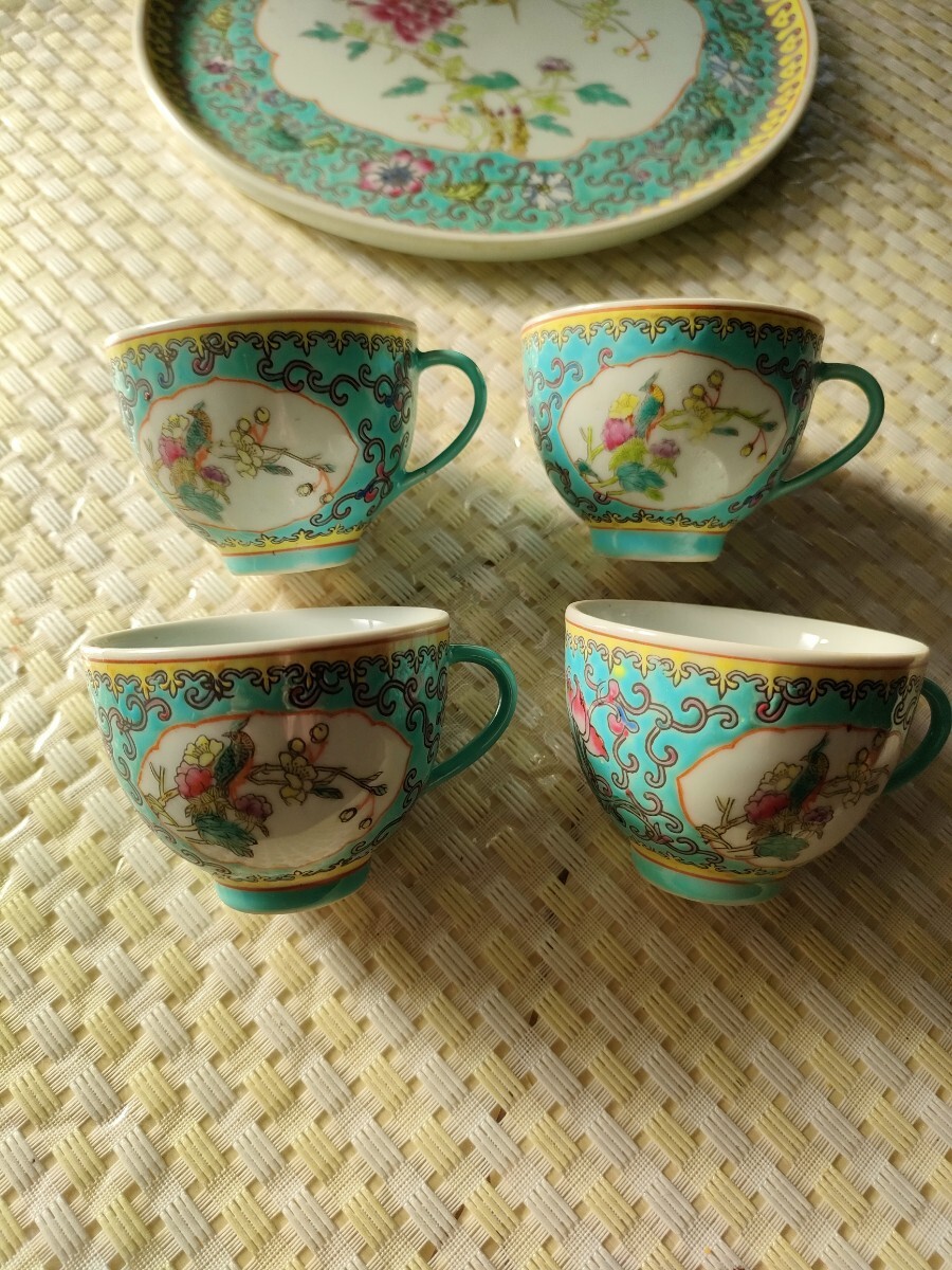 ●【美品・希少柄】景徳鎮風 中国陶磁器 ティーセット 花鳥図 色絵 金彩 カップ&ソーサー4客セット アンティーク調