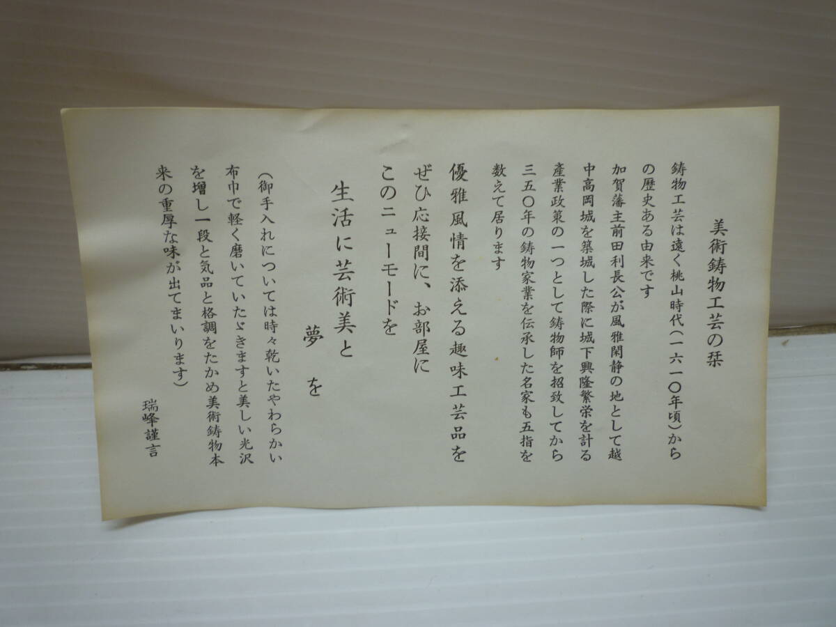 この度は当ショップ“自由基地”の商品をご覧いただきまして 誠にありがとうございます!! 下記内容をご確認のうえ、お気に入りいただけましたら、 オークションにご参加くださいませ。 商品の説明は主観によるもので完全な見立てでもありません。 見落としがあるかもしれません。必ず画像の参照をお願い致します。 完璧な商品をお買い求めの方はご入札をお控下さい。 ∇年末年始の営業につきまして∇ 12月31日(水)~1月4日(日)までの期間、 当社営業をお休みとさせて頂きます。 【質問・取引ナビ・送料のご連絡・発送】が遅れますので、 予めご了承下さいませ。 ∇日本郵政発送商品につきまして∇ 12月30日(火)午前中までに入金確認がとれますと、 12月30日に発送可能ですが、 商品により発送が間に合わない場合もございます。 年明けの発送は1月5日(月)以降を予定しております。 ※らくらく家財便での配送指定の商品はのぞきます。 ★商品情報 高岡銅器 亥 飾り皿 鉄器 干支 置物 インテリア 伝統工芸品 ★状態 保管品のため経年劣化がみられる場合がございます。 商品の状態は画像にてご確認下さい。 ★寸法 外形寸法 直径22㎝ 高3㎝ 重量 約1.1㎏ (素人採寸の為、参考程度にお願いします) ★発送 【送料一律1,100円】(税込) ※北海道、沖縄、離島へのお届けは別途追加送料がかかりますので、 入札前にご質問等でお問合せ下さい。 画像に写っている物のみの出品内容となります。 説明内容を納得された上、入札をお願い致します。 落札商品に関しましては返品を行っておりませんのでご注意下さい。 【その他】 ●商品は検品を行っておりますが、小さな傷や汚れを 見落としている場合がございますので、その点ご了承下さい。 ●こだわりのある方、神経質な方の入札はご遠慮下さい。 ●ノークレーム・ノーリターンでお願いいたします。 ●即決・価格交渉・ご質問、気になる事がありましたら【質問】よりご連絡ください。 ●当店では【代金引換・着払い】での発送は行っておりませんので、 【商品代金+送料】のご入金が確認出来次第の発送となります。 (振込み手数料はお客様負担となります。) ●当店の規定により、ご入金は落札後3日以内をお願いしております。 また、発送は入金確認後なるべく即日発送を行います。 (但し、日曜日、祝日、らくらく家財便での発送商品は除く。) ●お荷物の時間指定・日付指定が出来ます。ご都合の良い時間帯をご連絡下さい。 ●営業時間外のお取引(質問返答など)は出来ませんので、予めご了承下さい。 +++++++++++++++++++++++++++++++++++++++++ 自由基地 アクトサービス株式会社 内 (石川県公安委員会許可 第511030012140号) 石川県金沢市畝田西1丁目197番地 連絡先 076-225-7458 携帯 090-5171-5686 営業時間 9:00~17:00 定休日 日曜.祝日(その他) ※急な出張買取で留守にする場合もございます。 大型商品は別倉庫に保管してある場合がございますので、 来店の際は事前にご連絡頂ければスムーズにご用意できます。 +++++++++++++++++++++++++++++++++++++++++ |