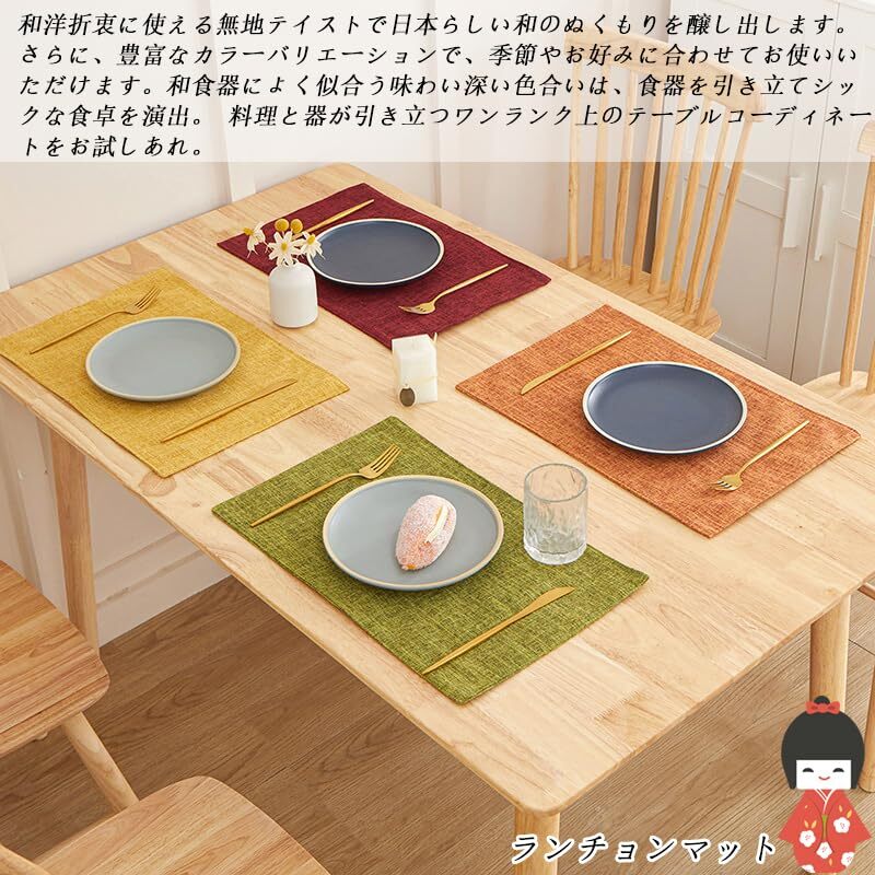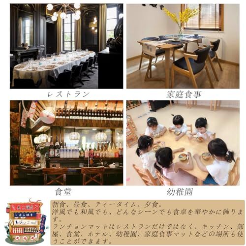 【様々な場所で活躍】ランチョンマットはレストランだけではなく、キッチン、部屋、食堂、ホテル、幼稚園、家庭食事マットなどの場所も使うことができます。ご注意:配送の都合上、折りたたみ状態で配送いたします。それにより折り目が付いている場合がありますが、時間経過と共に消えていきます。お気になる場合は低温でアイロンをかけていただくとより効果的です。