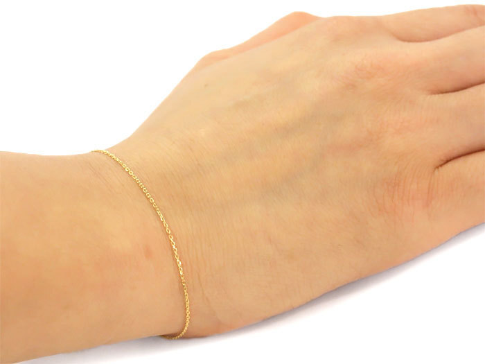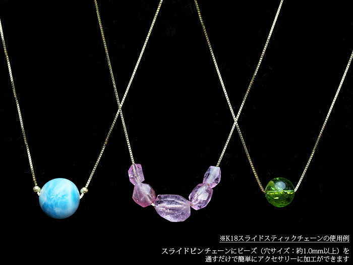 | 日本製の高品質K18ブレスレットチェーン。 素材:10金イエローゴールド 長さ:18cm 線経:0.28mm ピン太さ 0.75mm スライドボール太さ 2.8mm 重さ: 0.59g 画期的な10金のスライドピンチェーンが入荷しました!! スライドピンチェーンの先端からボール部分に通すので約1.0mm程度の穴があればどんなビーズでも通すことが可能です!! 特徴 純金(24金)に対し10金とは、10金÷24金=0.42、つまり、42%が金で残りの58%が他の金属ということになります。 10金は18金に比べ、変形しにくく硬い素材の為、10金の方が傷がつきにくいとされています。 K10はリーズナブルで高級感のある素材として、近年注目を集めています。 ※スライドピンチェーンご使用時の注意事項 シリコン入りボール・ピンチェーンの摩耗・破損を防ぐために、着脱時は引き輪部分をご使用ください。 過度にピン部分を抜き差しされますと、ピンの脱落などの原因となります。 穴の小さい石は通りづらい場合がございますので、無理に通さないようご注意ください。