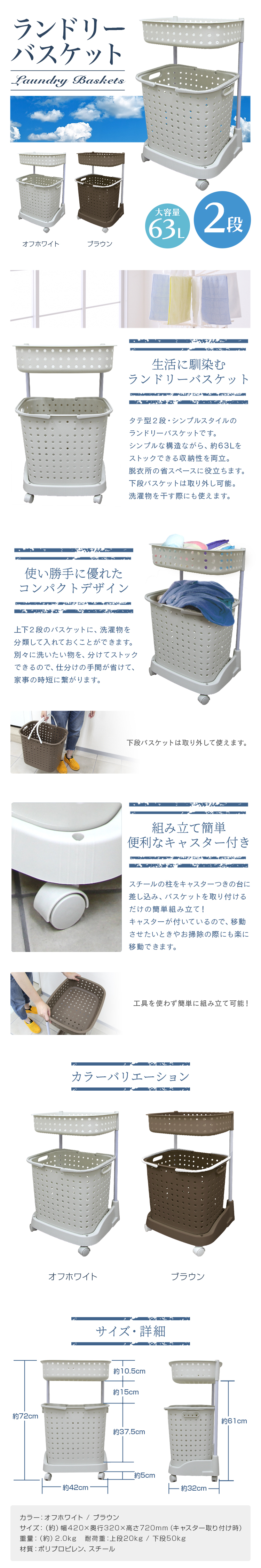 | サニタリースペースをすっきり出来ます。 上段の浅バスケットにはバス用品、洗濯機まわりの小物が収納できます。 入浴時の着替えや脱衣カゴとしても重宝します。 下段のバスケットは大容量の深型タイプ!洗濯物干し場までの移動に便利なハンドル付き。 移動に便利なキャスター付きです。 【商品仕様】 カラー:ホワイト サイズ(約):幅420×奥行320×高さ720mm(キャスター取り付け時) 重量(約):2kg 容量(約):63L 材質:ポリプロピレン、スチール 組立式 |