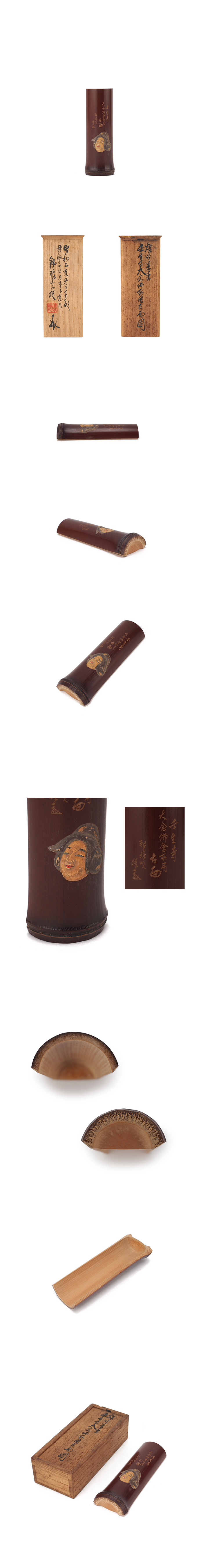 【市川鉄琅(1902年~1987年)彫刻家。 東京生。本名は虎蔵。 師、加納鉄哉が復活させた鉄筆彫刻の、 最後の継承者として技法を受け継いだ名工。 奈良に住み若年期の細密彫刻から 熟年の奈良一刀彫りなど多数の作品を残した。 師の鉄哉から「鉄良」の雅号を受け、 二十二歳の折に「鉄琅」と改名。 三十代で聴力を失いながらも、 製作を続け名誉利益を欲せず、個展活動に終始す。 金属茶道具に鉄筆の自由な筆致で花鳥風月を描き、 絵画と彫刻を結ぶ技法と評価される。】 在銘、共箱、真物保証。 |