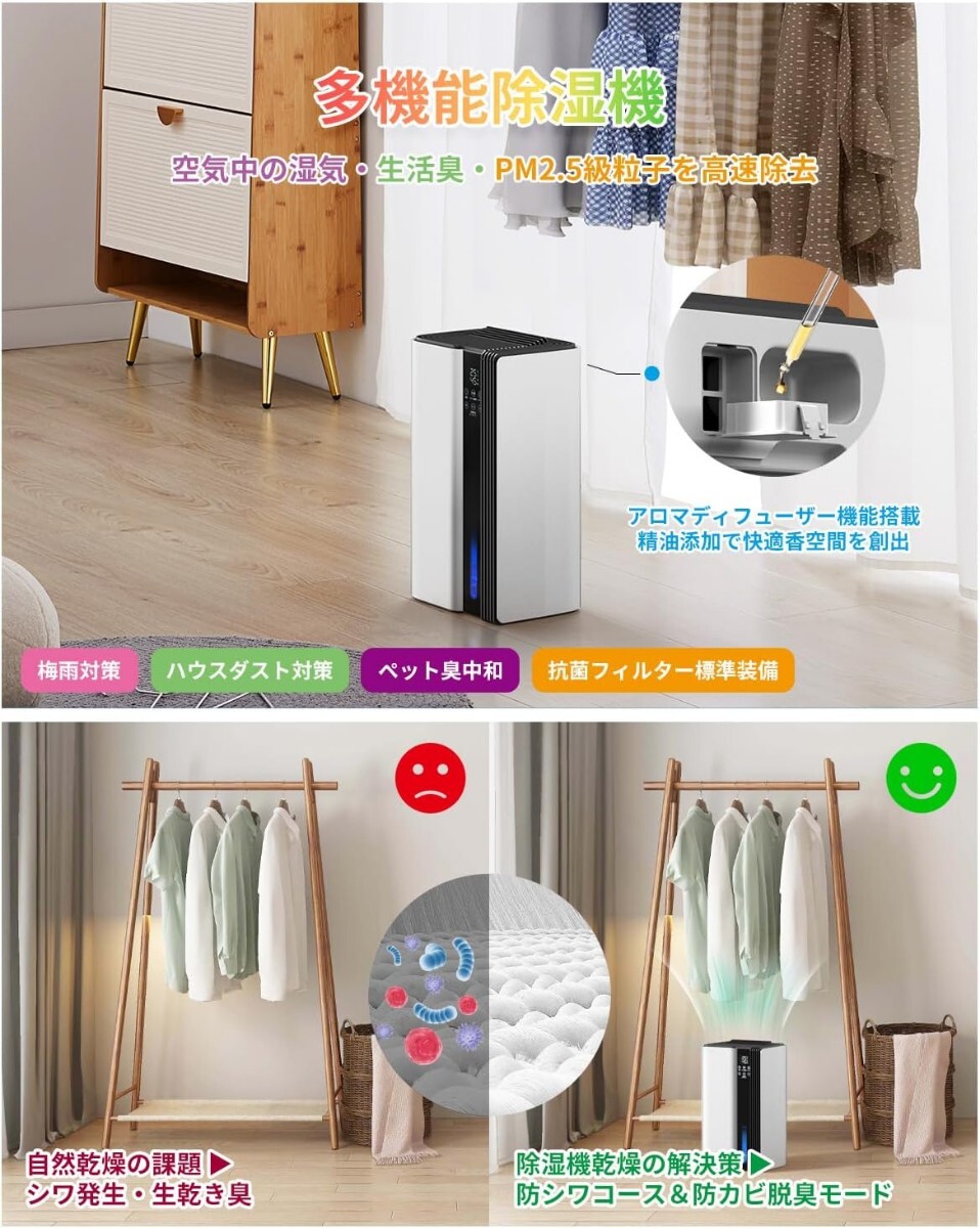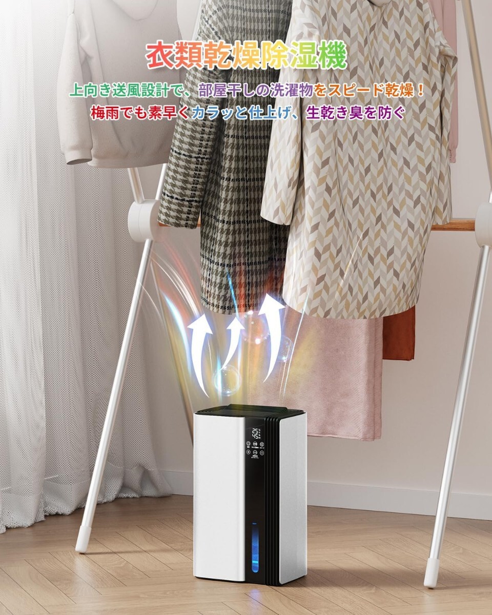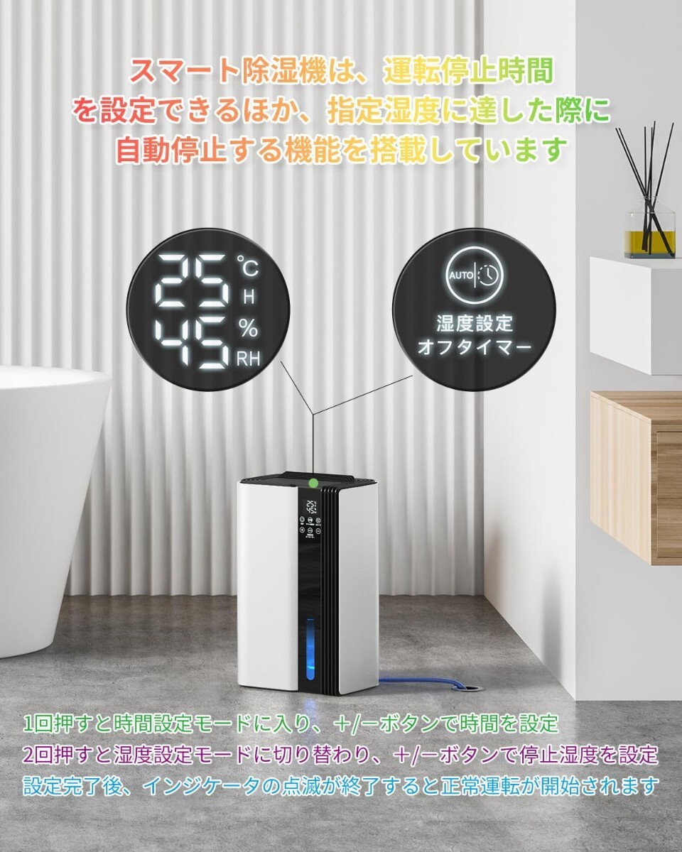 【多様なスペースに最適】鉄筋20畳 / 木造10畳の部屋、浴室、小型地下室、寝室、クローゼット、キャンピングカー、キッチンなどに適しています。この除湿機は湿度を45%以下に保ち、高湿度に伴う不快感や健康問題を防ぎます。これにより、より清潔で健康的な室内環境を実現します