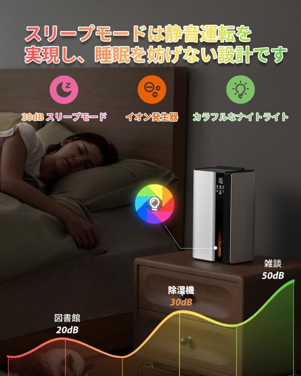 【静音&多用途モード】この除湿機は、高出力モードと超静音スリープモード(30dB)という2つの異なるモードを提供します。用途に応じて簡単に切り替えることができ、快適な湿度を保ちながら静かな夜の睡眠を確保します