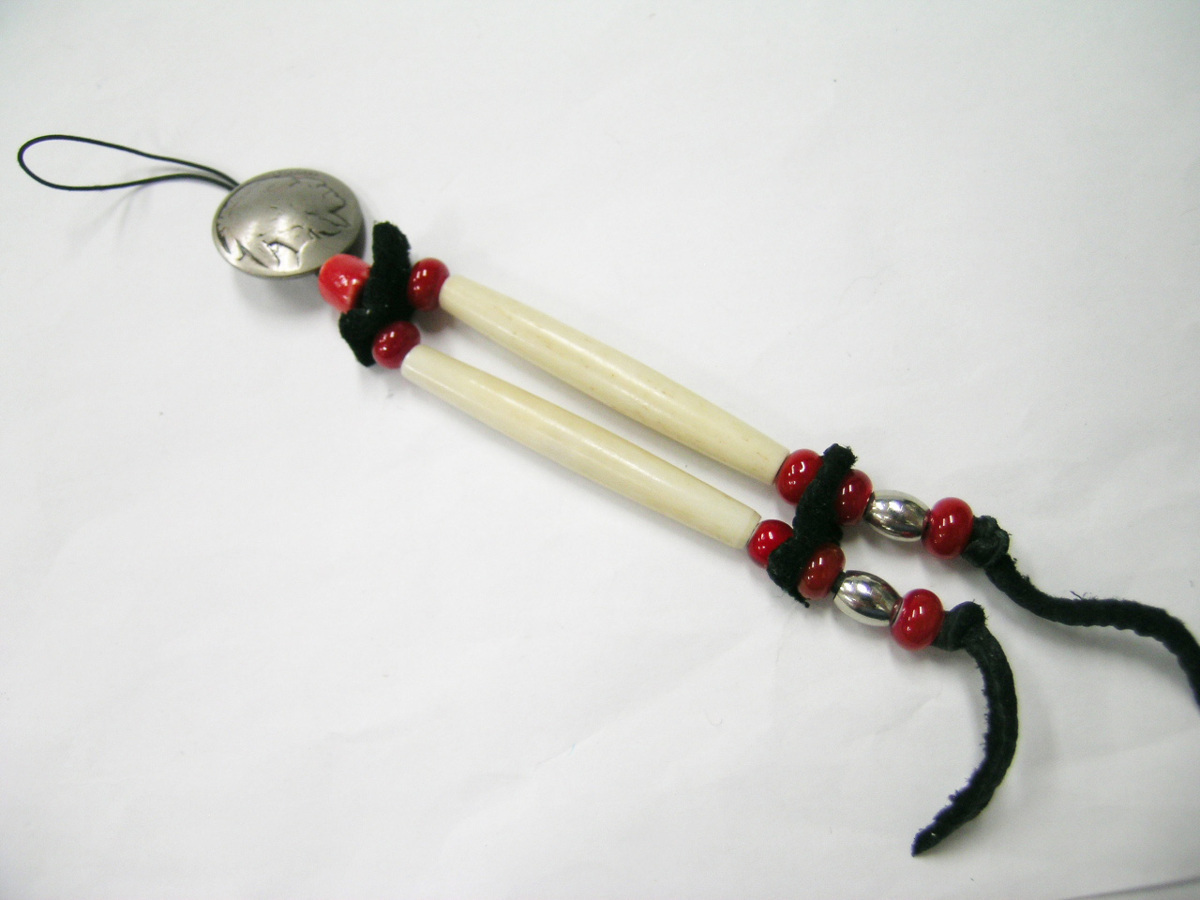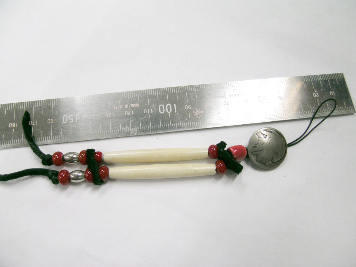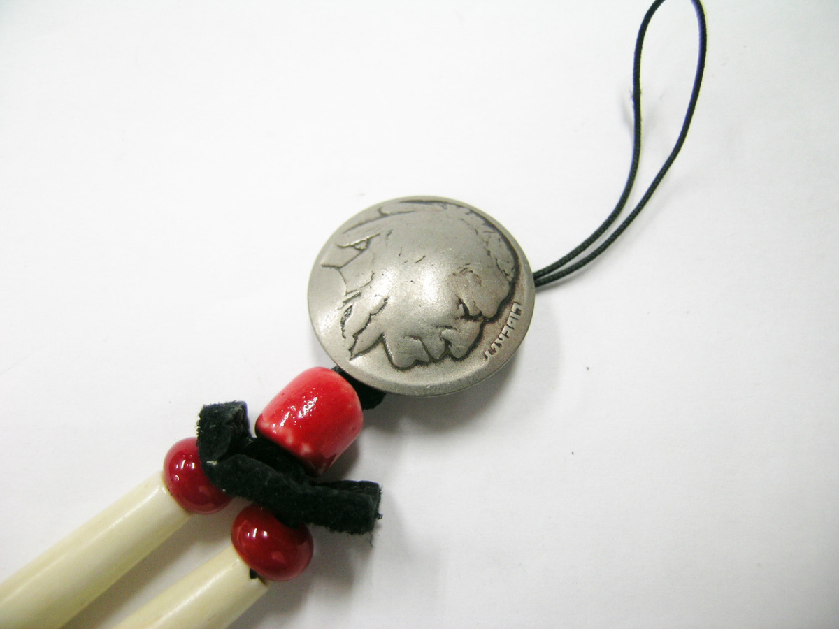 ハンドメイド インディアンコンチョ(5セントコイン)、赤のガラスビーズ、ボーンビーズ(アイボリー)を使用したストラップです。