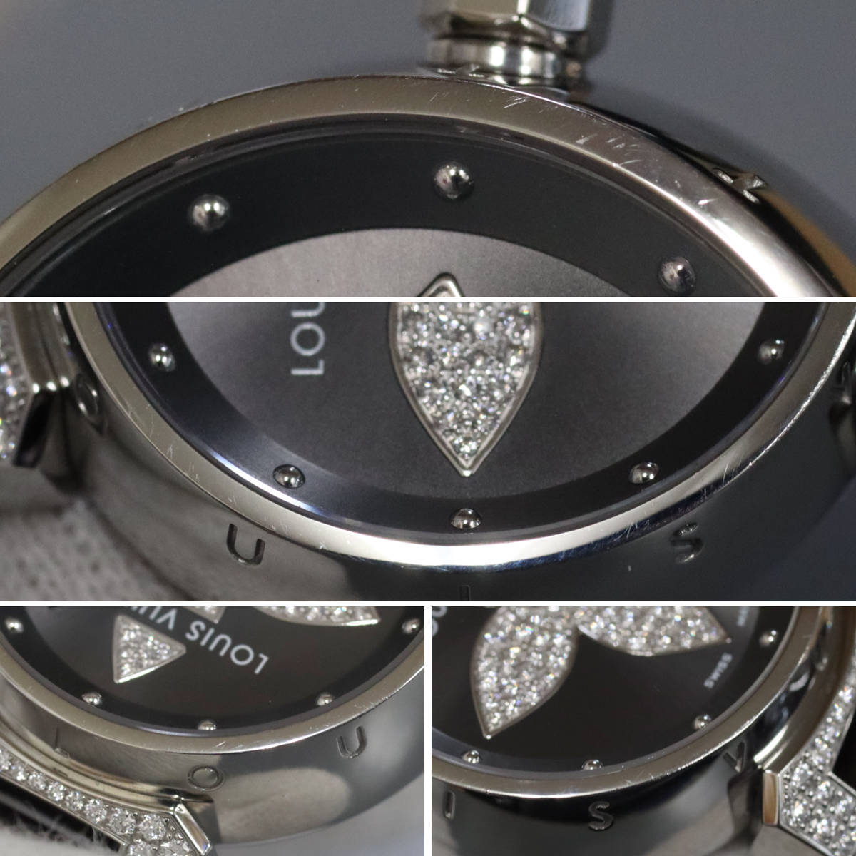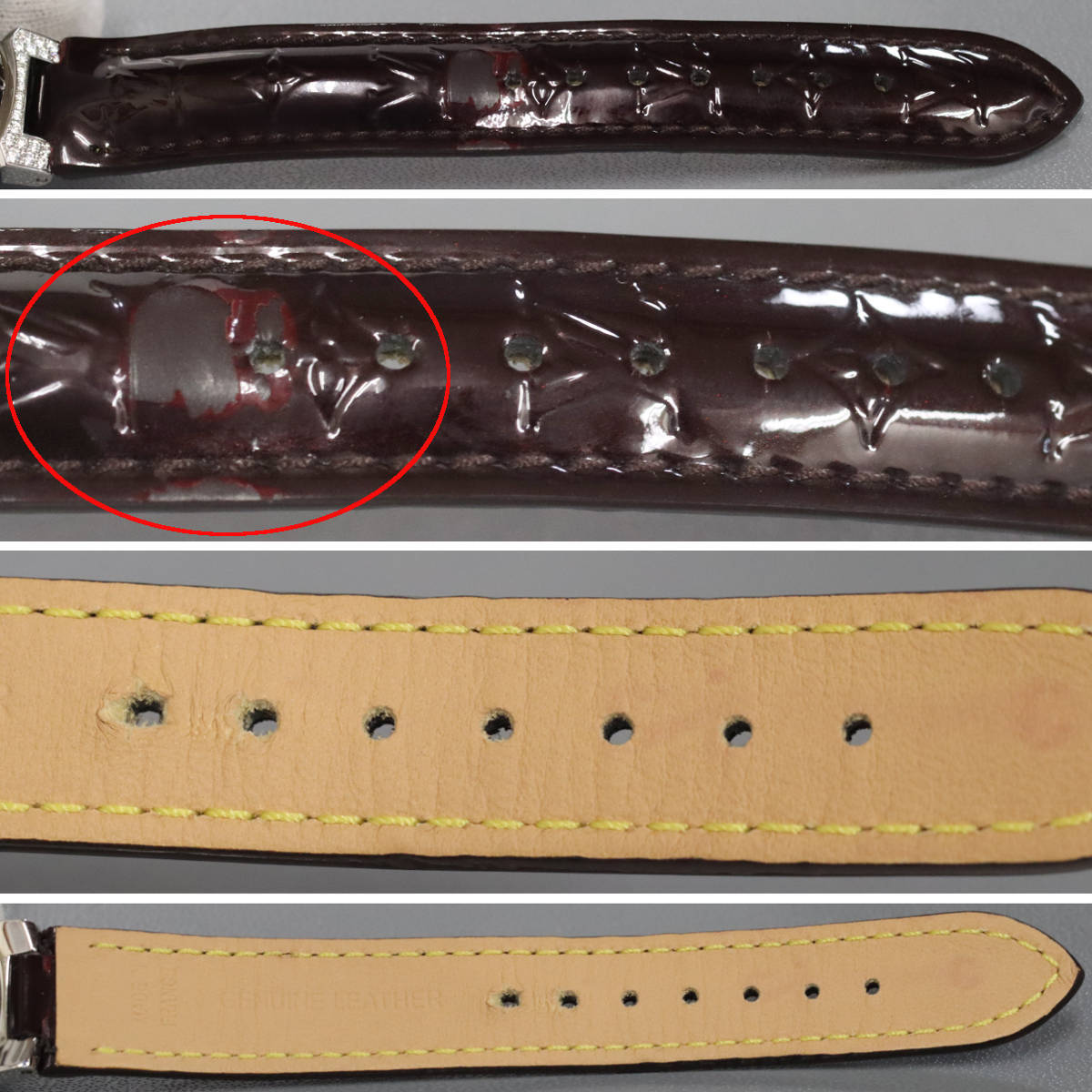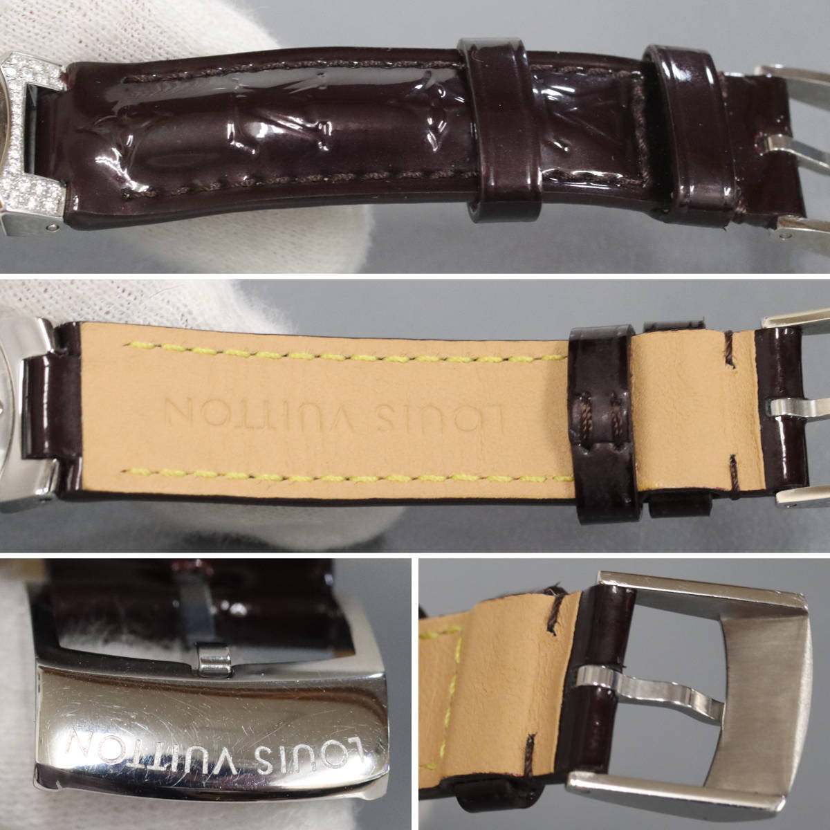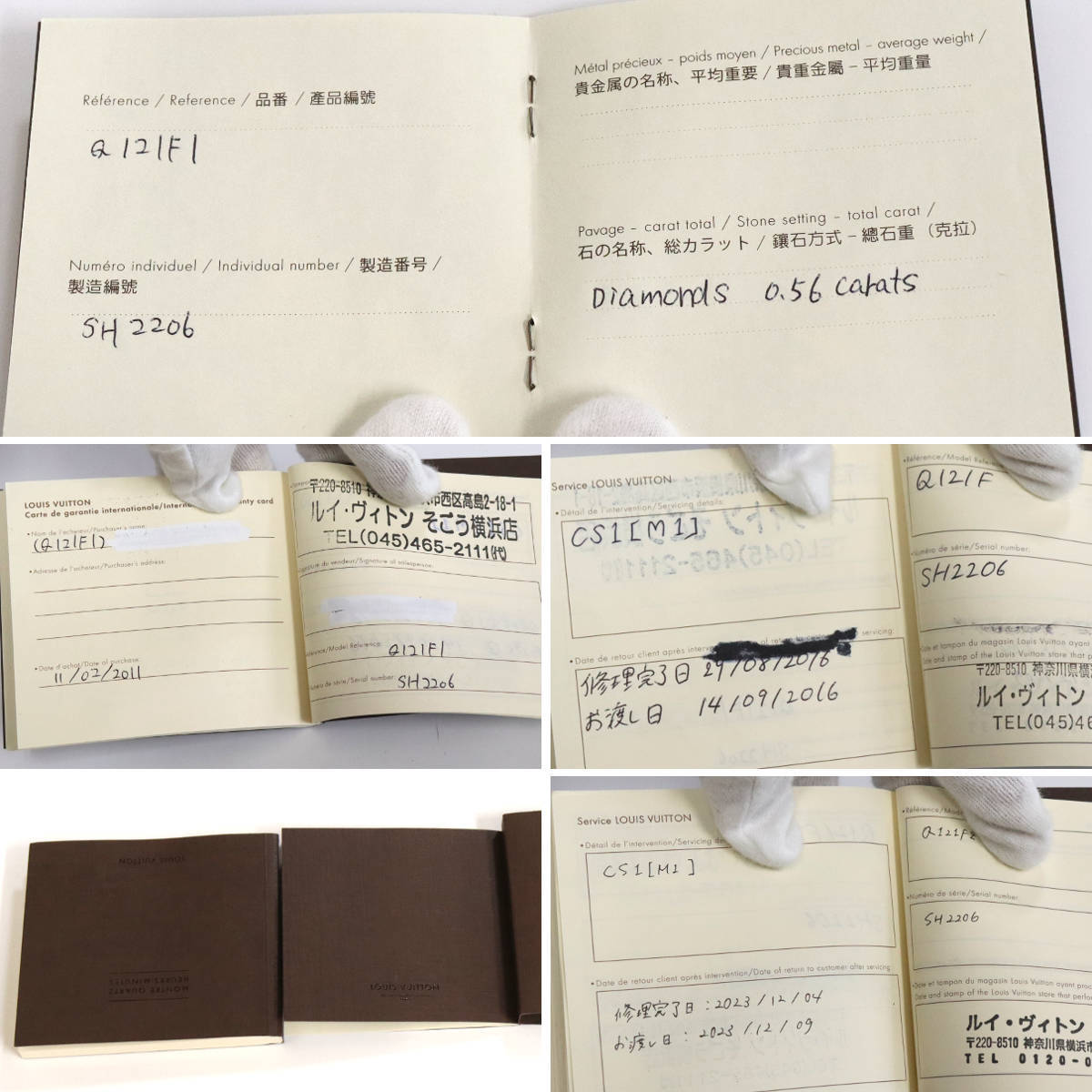 | ルイヴィトンのレディースウォッチ、タンブールフォーエバー(Q121F1)の中古品です。 総計0.56カラットのダイヤモンドがあしらわれています。 2016年と2023年に修理の記録があります。 レザーベルトに剥げがあります。 ベゼル、ケース側面、尾錠に細かな傷があります。 付属品は以下の通りです。 保証書