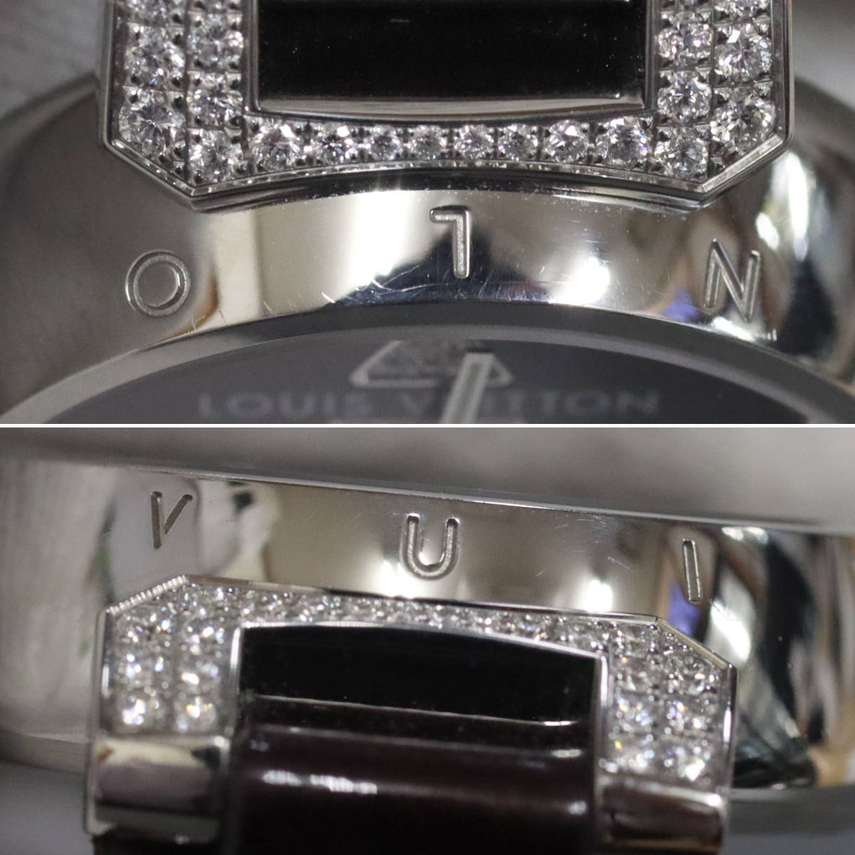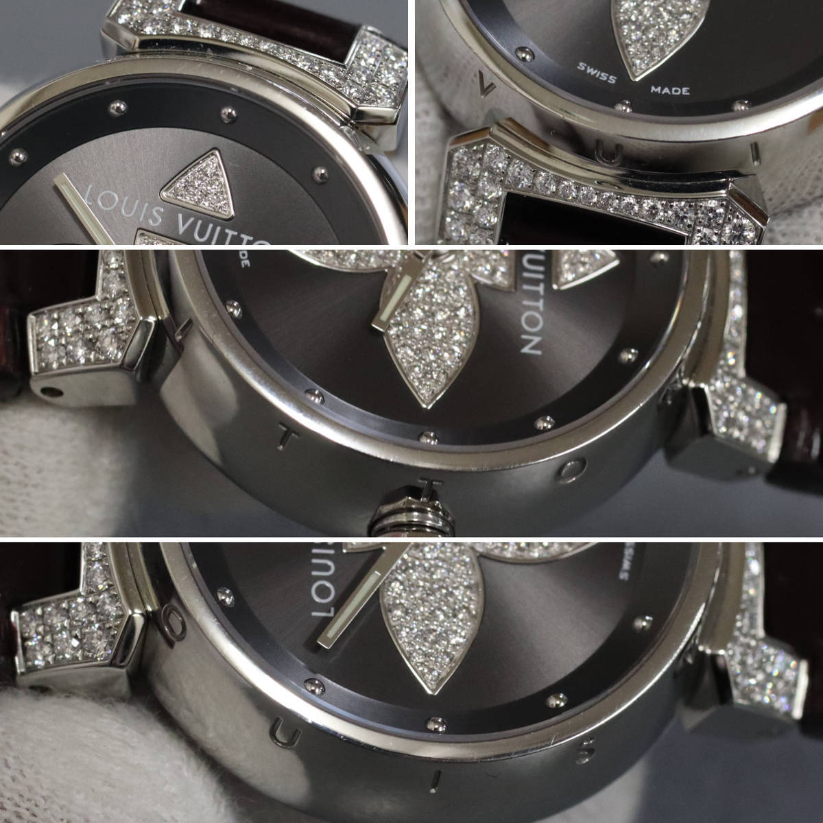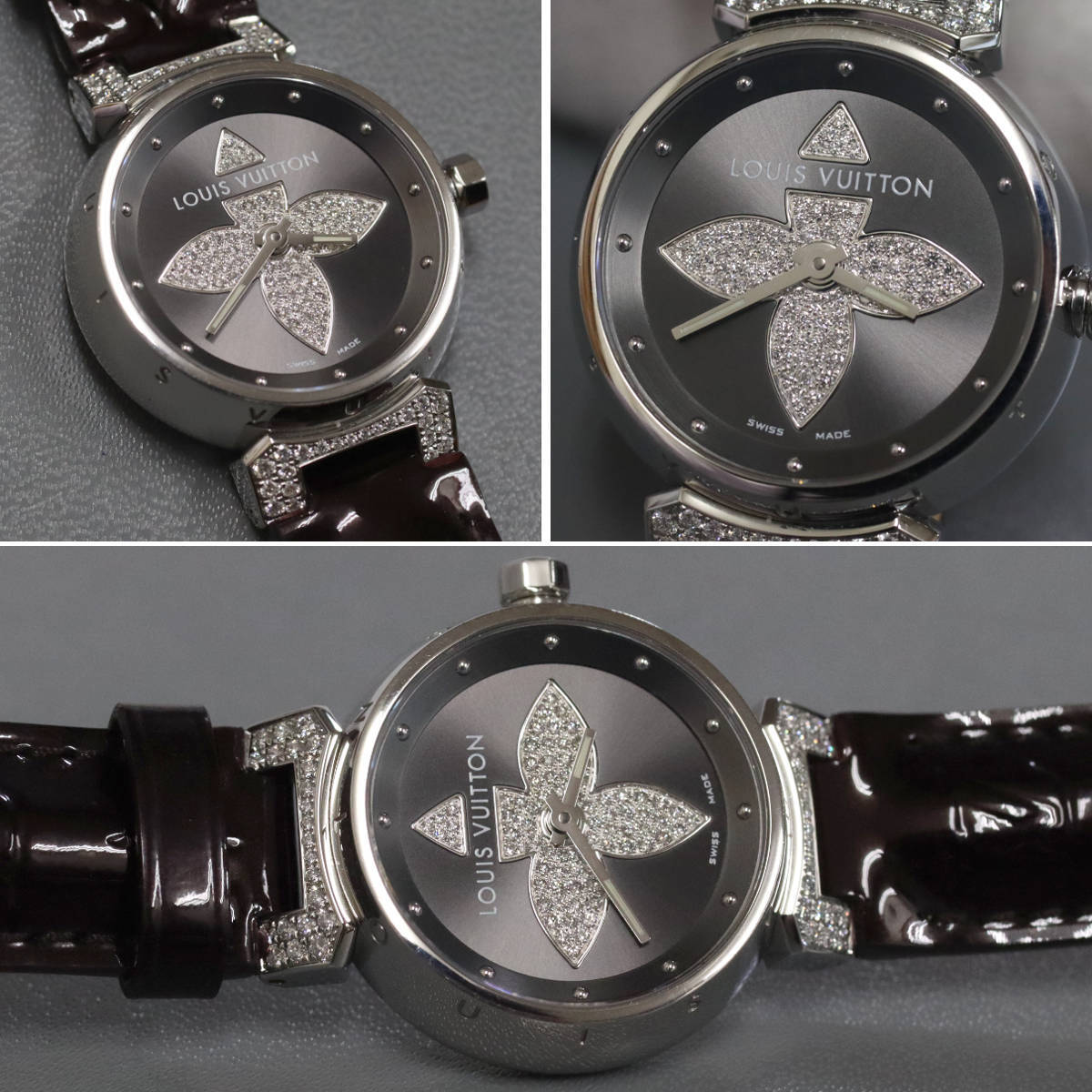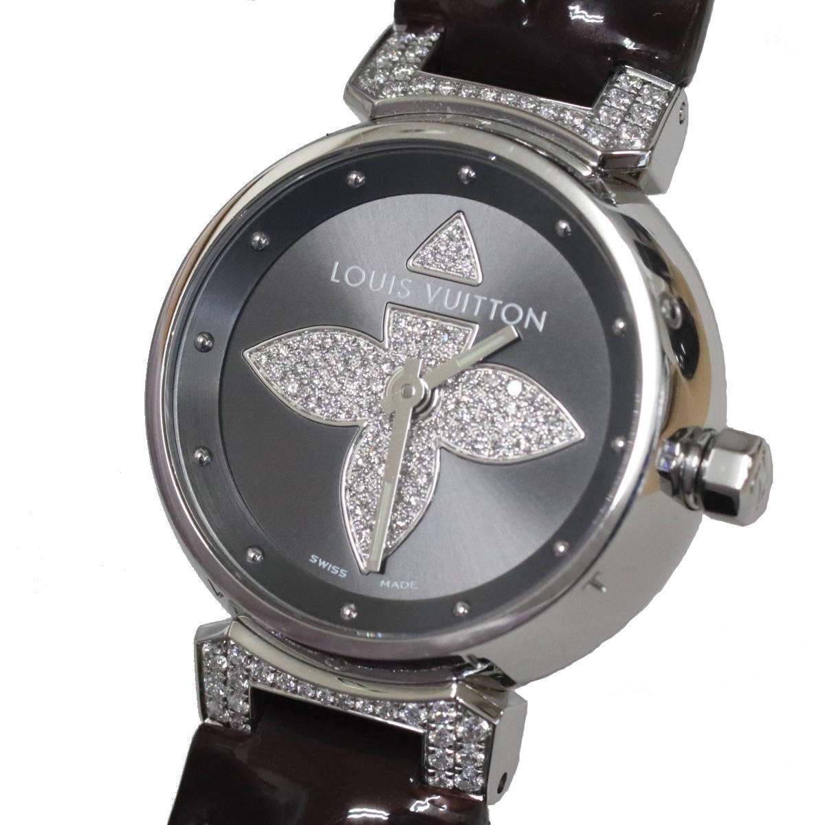 | ルイヴィトンのレディースウォッチ、タンブールフォーエバー(Q121F1)の中古品です。 総計0.56カラットのダイヤモンドがあしらわれています。 2016年と2023年に修理の記録があります。 レザーベルトに剥げがあります。 ベゼル、ケース側面、尾錠に細かな傷があります。 付属品は以下の通りです。 保証書